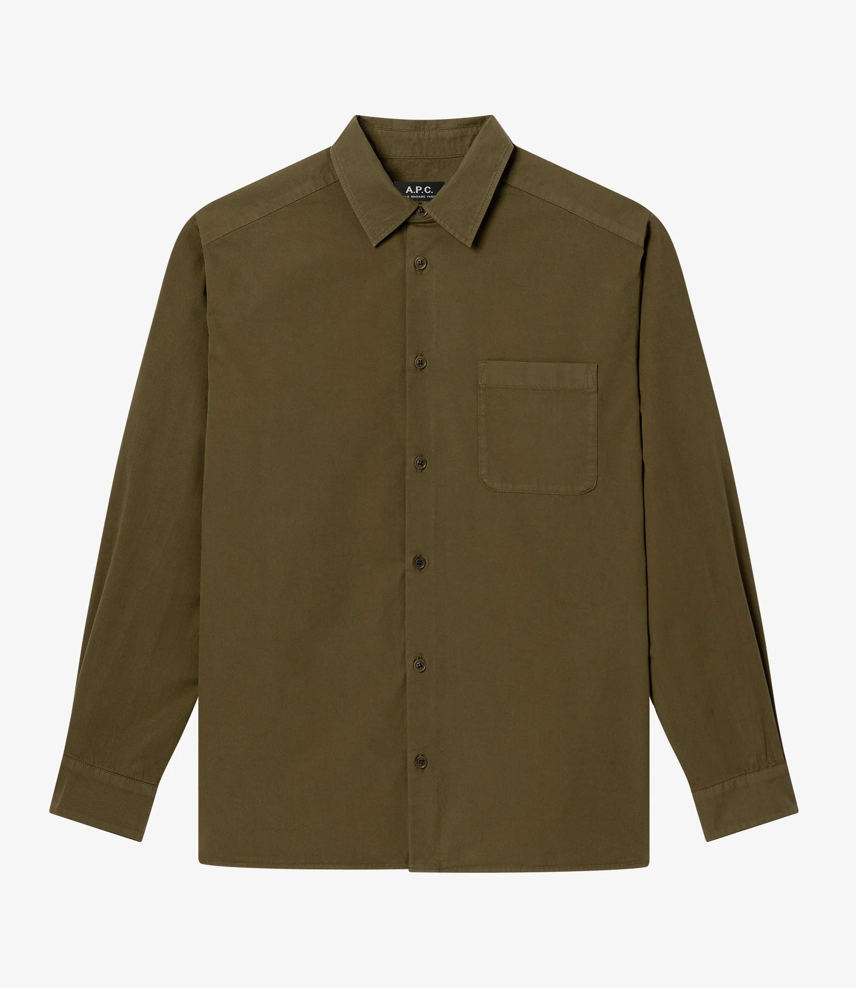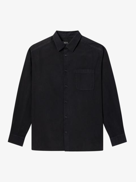 - Dyed vintage-effect material. - Straight cut. - Classic collar. - One pocket over the heart embroidered with the A.P.C. logo. - Faux horn buttons. - 100% organic cotton. Size Advice - Tristan is 6'1 tall and is wearing size M. - This item sizes normally. We recommend that you select your usual size. Composition & Material - 100% cotton. - Spanish material. - Made in Tunisia. - Machine wash cold (86°F) inside-out.