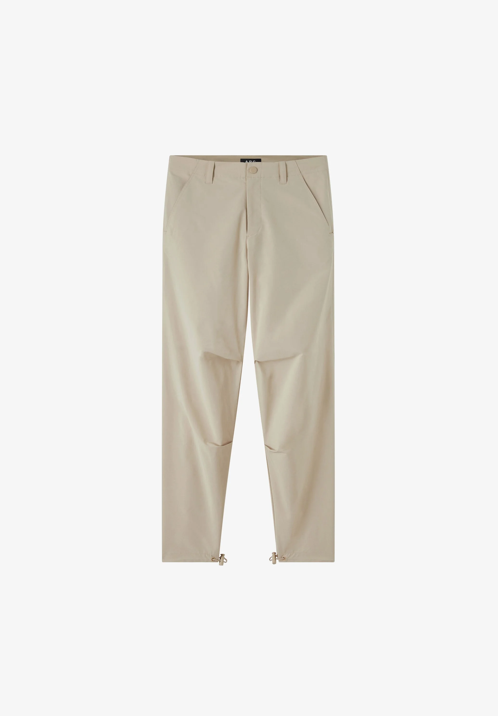 - Straight cut with a loose fit. - Mid-rise. - Two side pockets. - One back pocket with invisible snap button. - Elastic drawstring and stopper at the ankle. - Zip fly and tone-on-tone snap button. - 100% recycled polyester. Size Advice - Vincent is 6'1 tall and is wearing size M. Composition & Material - 100% polyester. - Made in China. - Dry clean only.