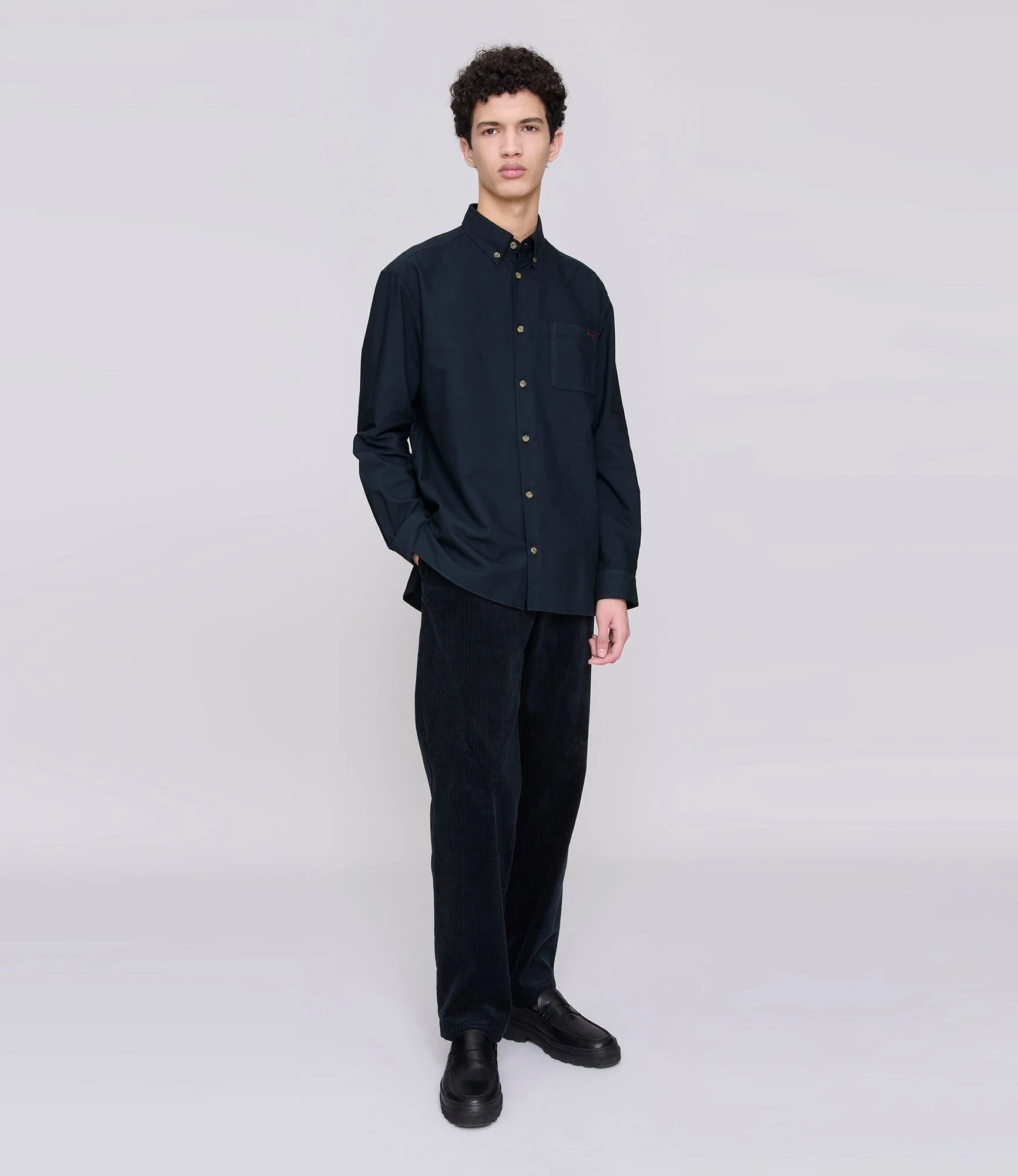 - Soft breathable material. - Straight cut with a slightly loose fit. - Button-down collar. - One pocket over the heart embroidered with a contrasting A.P.C. logo. - Buttons engraved A.P.C. - 100% organic cotton. Size Advice - Tim is 6'2 tall and is wearing size M. Composition & Material - 100% cotton. - Portuguese material. - Made in Tunisia. - Machine wash cold (86°F) inside-out.