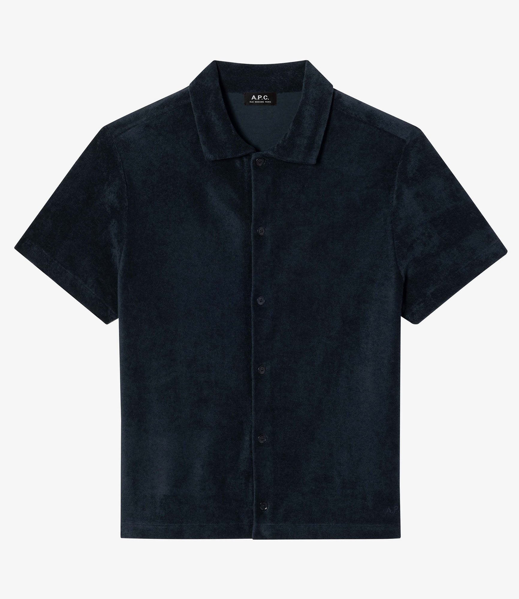 - Straight cut. - Classic collar. - Tone-on-tone A.P.C. logo embroidered at lower left. - Corozo buttons. - 100% organic cotton. Size Advice - Adam is 6'1 tall and is wearing size M. Composition & Material - 100% cotton. - Portuguese material. - Made in Portugal. - Machine wash cold (86°F) inside-out.