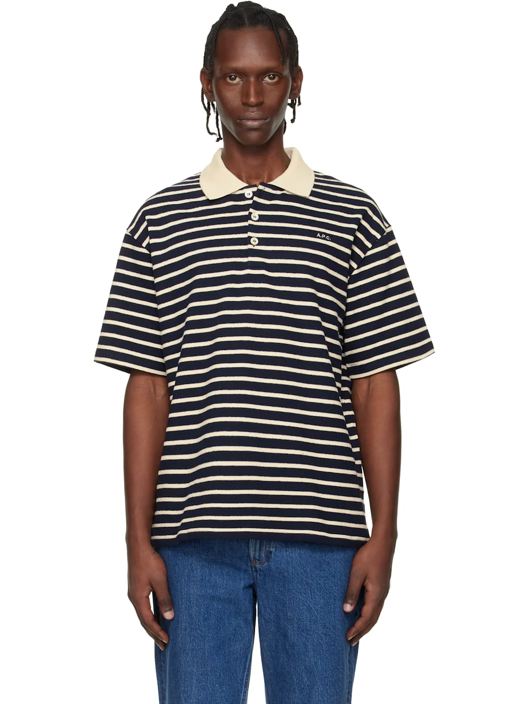 Organic cotton French terry polo. · GOTS-certified organic cotton · Stripes throughout · Rib-knit spread collar · Three-button placket · Logo embroidered at chest Supplier color: Dark Navy 100% cotton. Made in Portugal 261252M212008