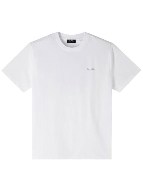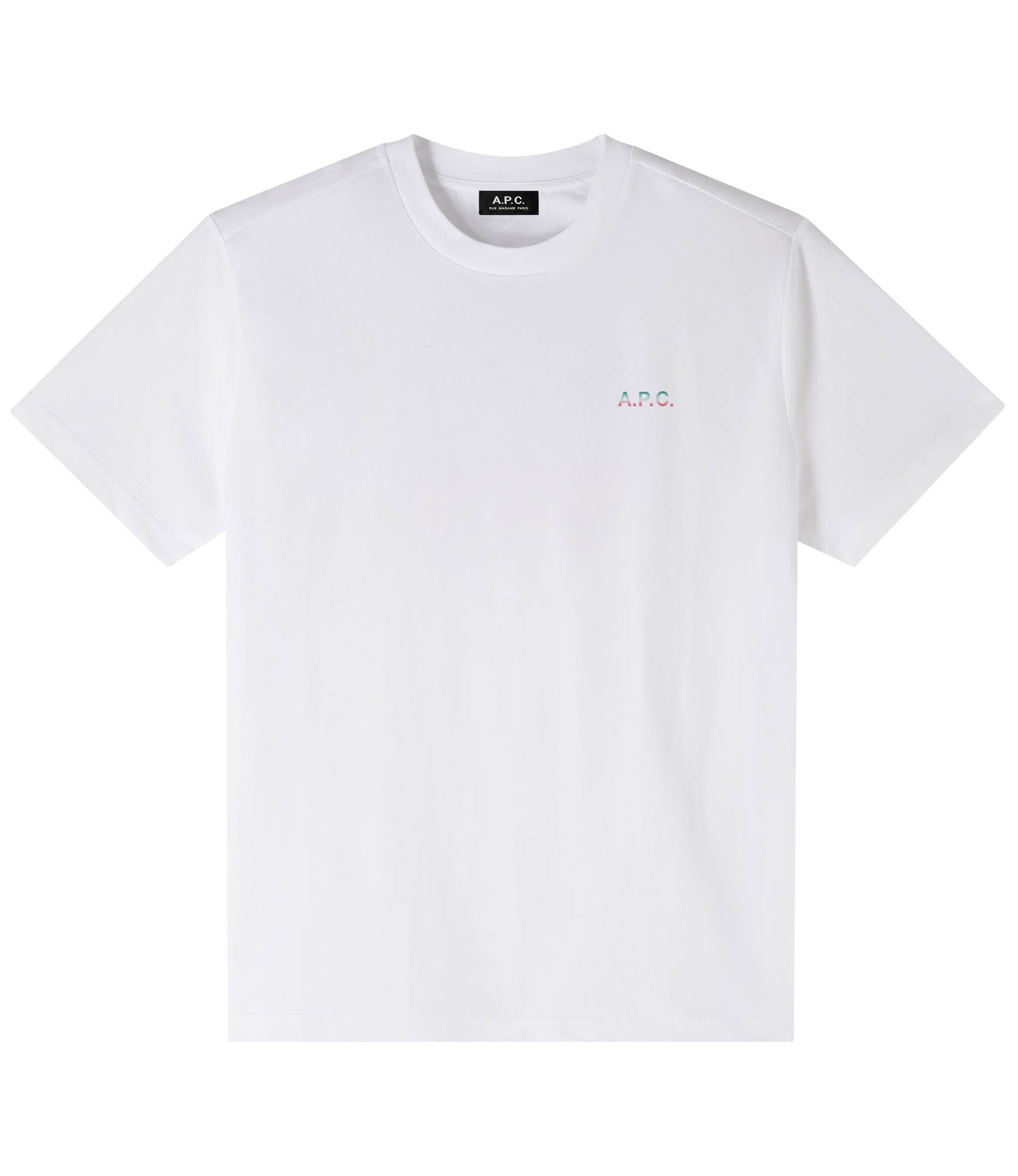 - Straight cut. - Crew neckline. - A.P.C. logo printed over the heart. Round 'sunset' gradient from green to red on back center. - Contains 100% cotton from organic farming. Size Advice - Antoine is 6'1 tall and is wearing size M. Composition & Material - 100% Cotton. - Portuguese material. - Made in Portugal. - Machine wash cold 65-85˚ F inside-out. Our commitments Through its RESPECT program A.P.C reduces (by implementing many practical measures to improve its environmental footprint) regulates (by respecting and enforcing its ethical responsibility on the part of its employees as well as its suppliers) and reuses (through its recycling vintage or quilts and butler programs for example).