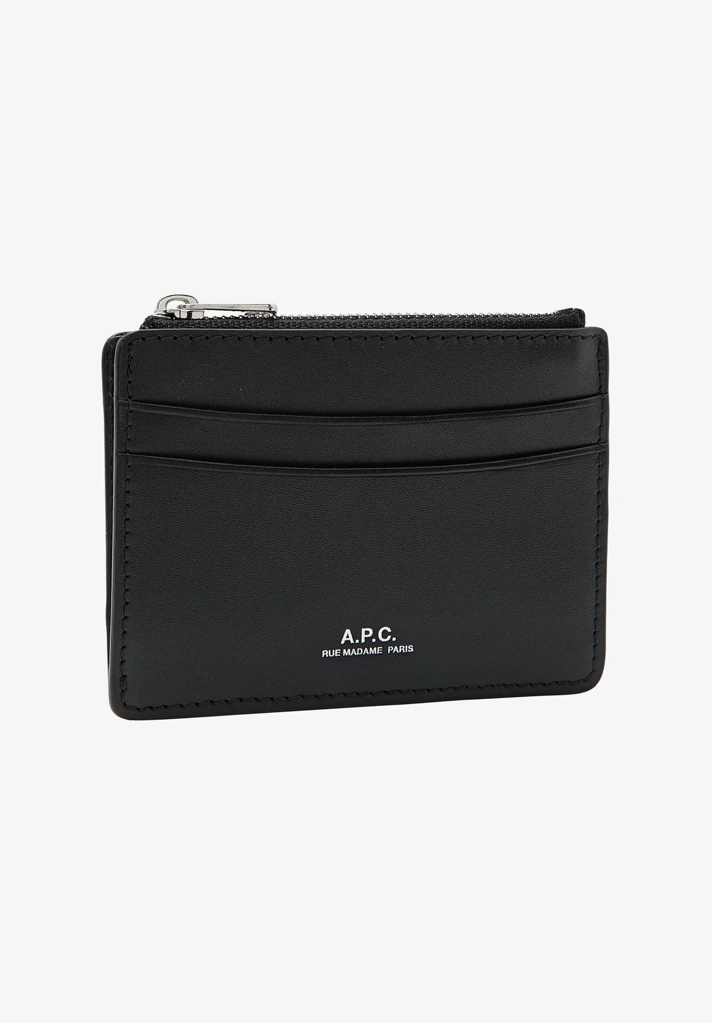 A.P.C. cardholder. - Two card slots on one side and one on the other. - One zip pocket in the center. - Embossed silvertone A.P.C. Rue Madame Paris logo. - Cardholder with a credit card format. Size Advice - Dimensions: 11 x 78 cm. - Cardholder with a payment card format. Composition & Material - 100% cowhide leather. - Spanish material. - Made in Morocco.