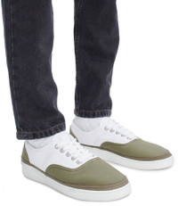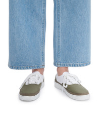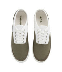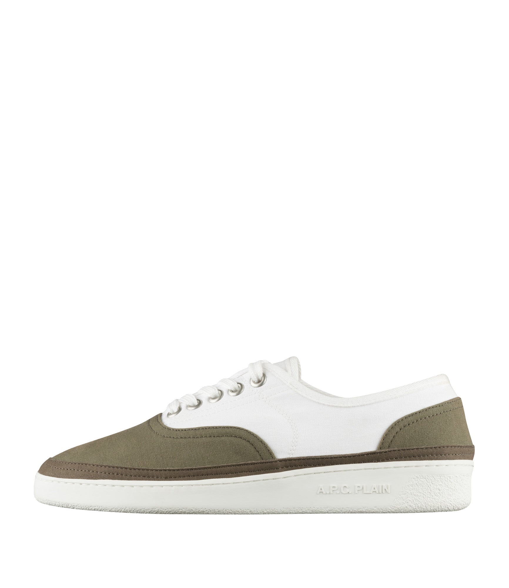 - Unisex model. - Khaki canvas in front and at the heel white on the rest of the shoe. - Metal eyelets. - Sewn-on sole with A.P.C. PLAIN in raised text on the side. - Flat laces. Size Advice - Sizes: 35 to 46. Composition & Material - 68% polyurethane. 32% cotton. - Portuguese material. - Made in Portugal. Our commitments Through its RESPECT program A.P.C reduces (by implementing many practical measures to improve its environmental footprint) regulates (by respecting and enforcing its ethical responsibility on the part of its employees as well as its suppliers) and reuses (through its recycling vintage or quilts and butler programs for example).