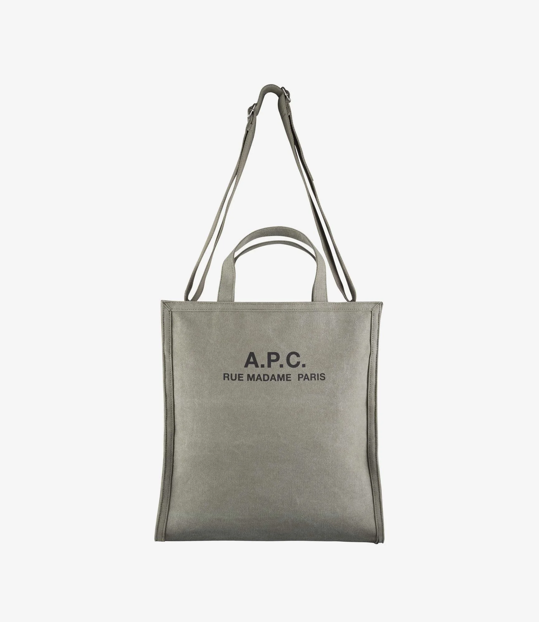 A.P.C. large tote bag. - Military-style raw cotton canvas. - Handles to carry the bag by hand. - Strap adjusts with a metal buckle to carry the bag on the shoulder or across the chest. - Two interior pockets. - Printed 'A.P.C. rue Madame Paris' logo. Size Advice - Dimensions: 15.7 x 14.1 x 4.3'. Composition & Material - 100% cotton. - Made in China.