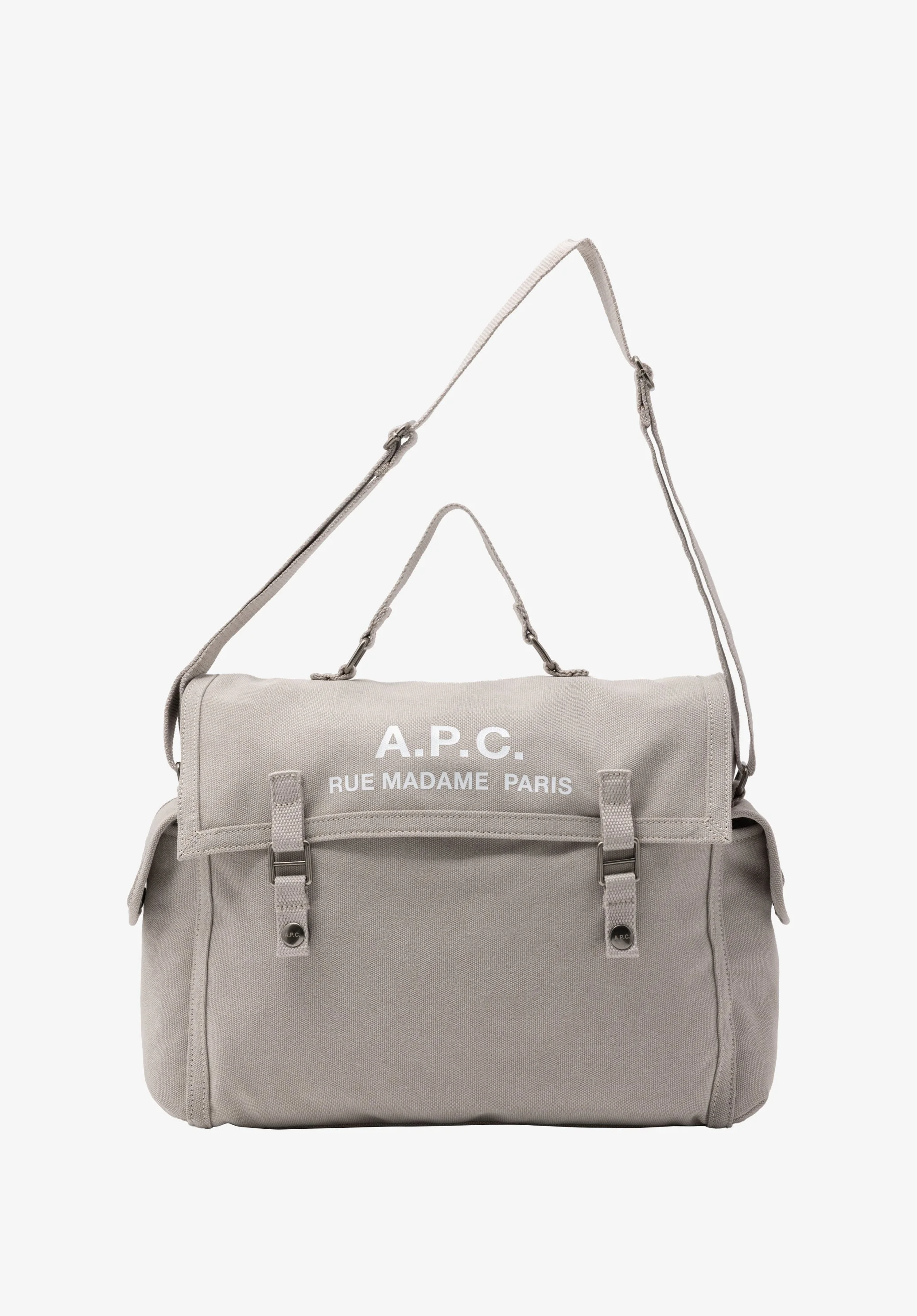 - Main pocket closes with snap buttons. - Two side pockets. - One interior zip pocket. - One snap pocket in back. - Adjustable strap to carry the bag on the shoulder or across the chest. - One handle to carry the bag by hand. - A.P.C. Rue Madame Paris printed logo. Size Advice - Dimensions : 34 x 25 x 10 cm. Composition & Material - 60% cotton. 40% polyester. - Made in China. - Care instructions: wipe with a soft dry cloth.