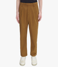 A.P.C. Men's pants. - Fits slightly loose. Size down if between sizes. - Peach-skin material. - Wide leg with slight carrot cut. - Front pleats at the waist. - Off-center buttoned placket. - Zip fly. - Two side pockets and one back flap pocket. - 100% organic cotton. Size Advice - Tim is 6'2 tall and is wearing size 48. - - Fits slightly loose. Size down if between sizes. Composition & Material - 100% cotton. - Spanish material. - Made in Tunisia. - Machine wash cold (86°F) inside-out.