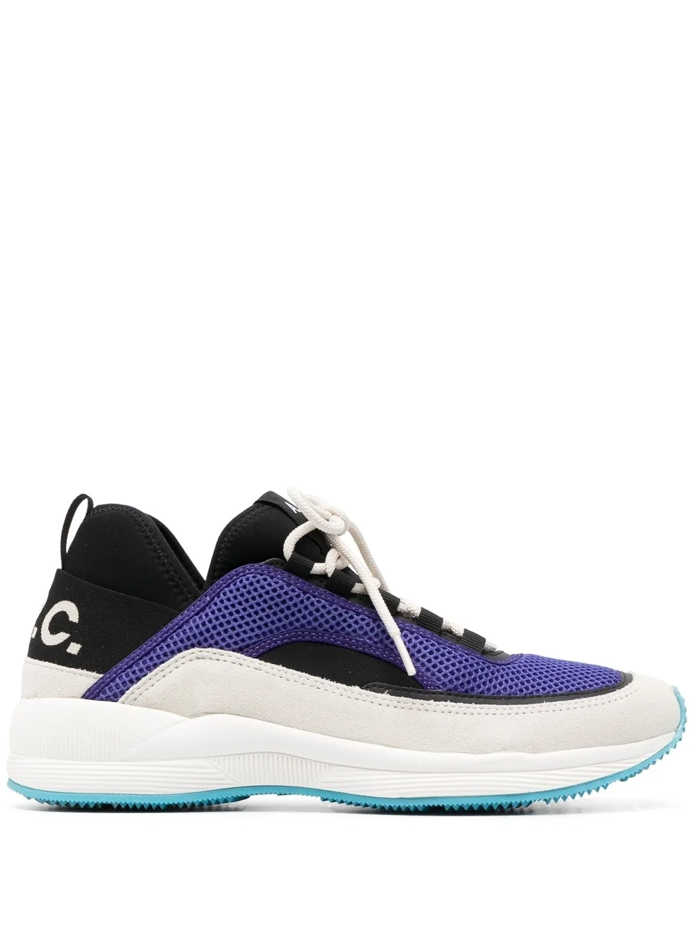 Run Around colour-block low-top sneakers A.P.C.'s Run Around sneakers are set on contrasting waffled outsoles for improved traction on unstable terrain. Crafted from suede, leather and mesh panels, this lace-up pair is detailed with the brand's logo at the heel. Highlights - Indigo blue/white/black - Calf suede - Colour-block panelled design - Logo print to the rear - Eyelet detailing - Front lace-up fastening - Almond toe - Chunky rubber waffle sole Imported Composition Outer: Fabric 100%, Calf Suede 100% Sole: Rubber 100% Lining: Fabric 100% SIZE & FIT Measurement HEEL 1.57 in(4 cm) Sole height 0.78 in(2 cm)
