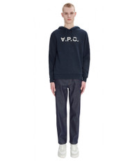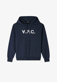 A.P.C. hoodie. - Unisex model. - Straight cut. - Crew neck. - Dark navy blue velvety flocked V.P.C. logo. - Tone-on-tone drawstrings. - This garment is GOTS certified which guarantees that it contains a minimum of 95% certified organic fibers and complies with strict social and environmental criteria throughout the production chain. Size Advice - Vincent is 6'1 tall and is wearing size M. Composition & Material - 100% cotton. - Made in Turkey. - Machine wash cold (86°F) inside-out.