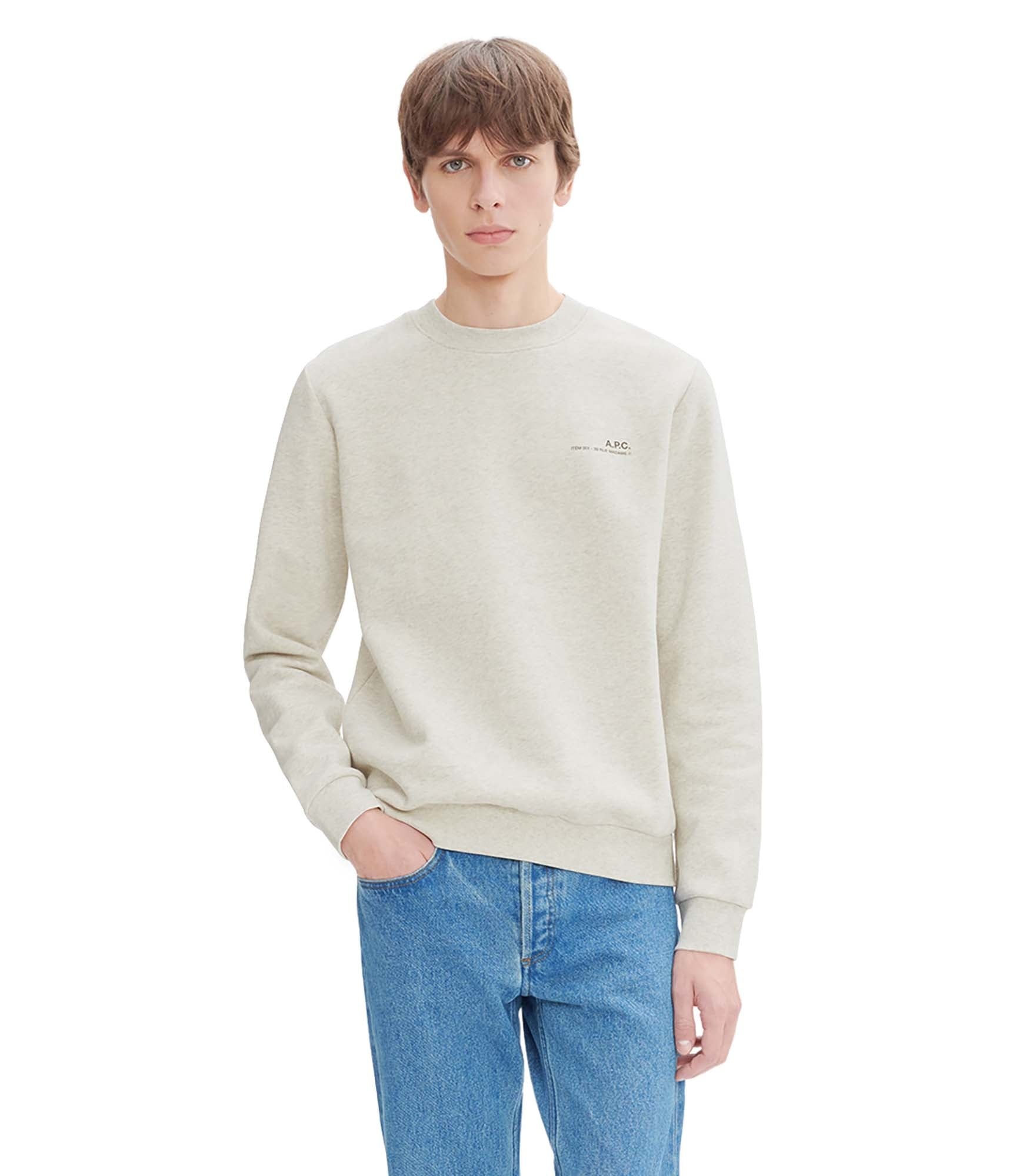 A.P.C. sweatshirt. - Unisex model. - Boxy cut. - Crew neck. - Small khaki A.P.C. ITEM 001 printed logo. - 100% organic cotton. Size Advice - Till is 6'2 tall and is wearing size M. Composition & Material - 100% cotton. - Portuguese material. - Made in Portugal. - Machine wash cold (86°F) inside-out.