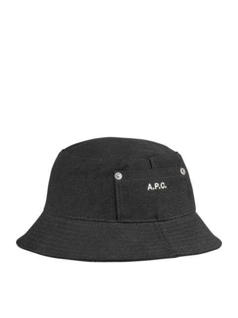 - Unisex model. - A.P.C. logo embroidered in black. - One jean-style pocket with rivets on the side. - Topstitched brim. - Caramel topstitching. - Reinforced headband. Size Advice - Sizes: 54 / 56 / 58 / 60 cm. Composition & Material - 100% cotton. - Made in Bulgaria. Our commitments Through its RESPECT program A.P.C reduces (by implementing many practical measures to improve its environmental footprint) regulates (by respecting and enforcing its ethical responsibility on the part of its employees as well as its suppliers) and reuses (through its recycling vintage or quilts and butler programs for example).