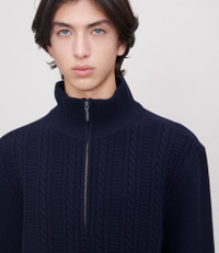 - Straight cut. - High zip-up collar. - Cable knit details and stripes on the body. - 100% RWS wool: Responsible Wool Standard a voluntary standard that attests to wool production that respects animal welfare. Size Advice - Leo is 6'1 tall and is wearing size M. - This item sizes normally. We recommend that you select your usual size. Composition & Material - 100% wool. - Made in Hong Kong. - Hand wash or delicate cycle.
