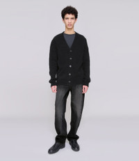 - Soft downy material. - Straight cut with a loose fit. - V-neck. - Faux horn buttons. - 25% recycled material. Size Advice - Adam is 6'1 tall and is wearing size M. Composition & Material - 65% alpaca. 25% polyamide. 10% wool. - Italian material. - Made in Romania. - Hand wash or delicate cycle.