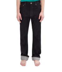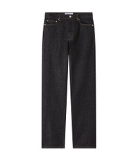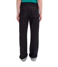 PRODUCT DETAILS A.P.C. x JW Anderson Men's jeans. - Straight, rather loose cut. - High rise. - Five pockets. - Button fly. - Button engraved 'A.P.C. rue Madame près du Luxembourg'. - Caramel topstitching. - 100% Cotton from organic farming. FABRIC & CARE - 100% organic cotton. - Portuguese material. - Made in Portugal. - Machine wash cold (30°C), inside-out. - Spin dry at minimum speed. - Do not tumble dry. - These jeans may seem shrunken after washing, but they return to their original shape when worn. SIZE - Joseph is 6'2" tall and is wearing size 30. - This style fits oversized. For true fit, size down 1 size.