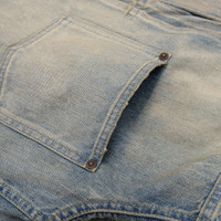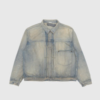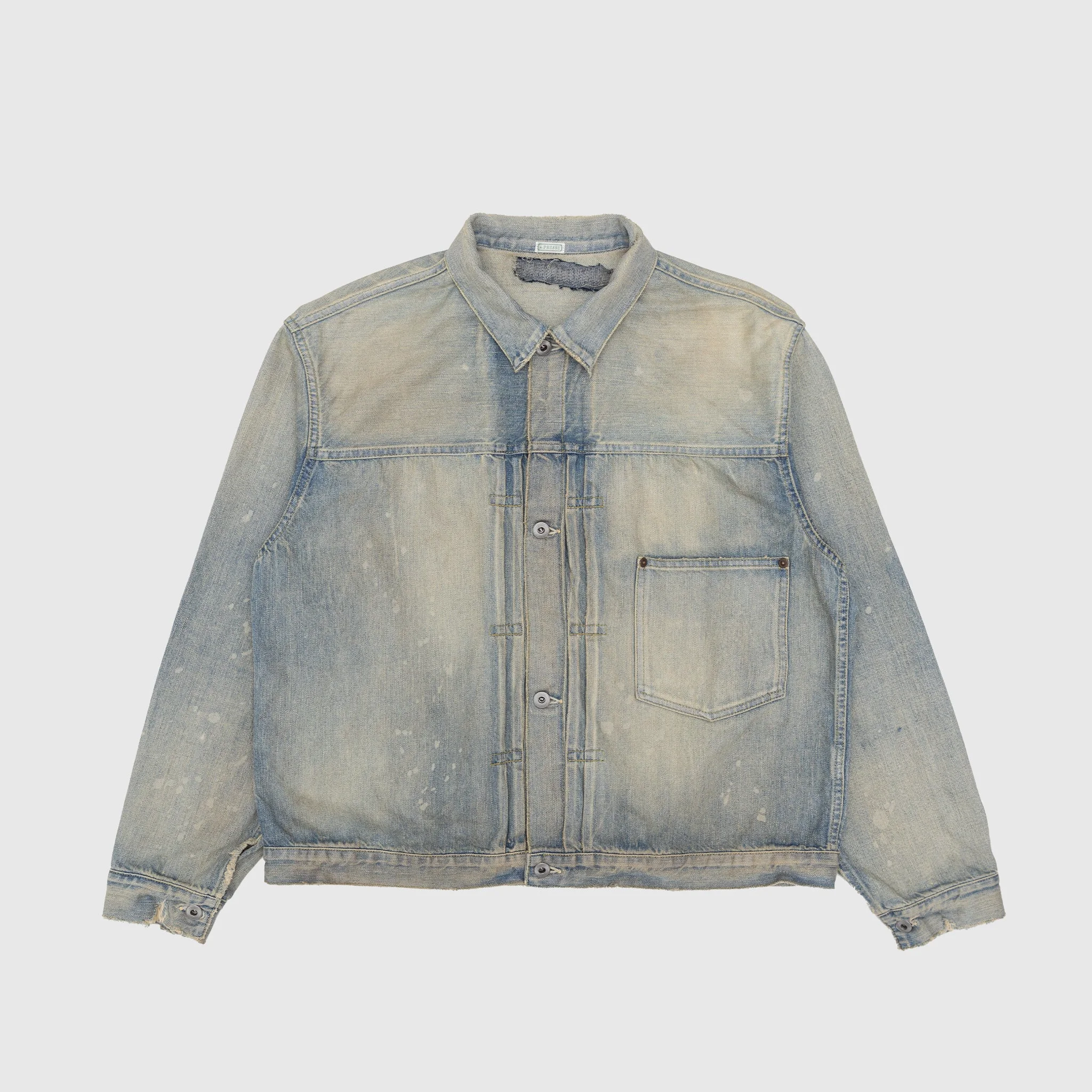 - 25AAP-01-60-BLCH - Bleach - 100% Cotton - 13oz Red Selvedge Denim - Front button closure - Double pleated front - Front chest pocket - Adjustable cinch tab at the back - Adjustable button cuffs - Regular fit - Made in Japan - Due to the hand processing, each jacket varies in texture, color, and damage, making every piece one of a kind