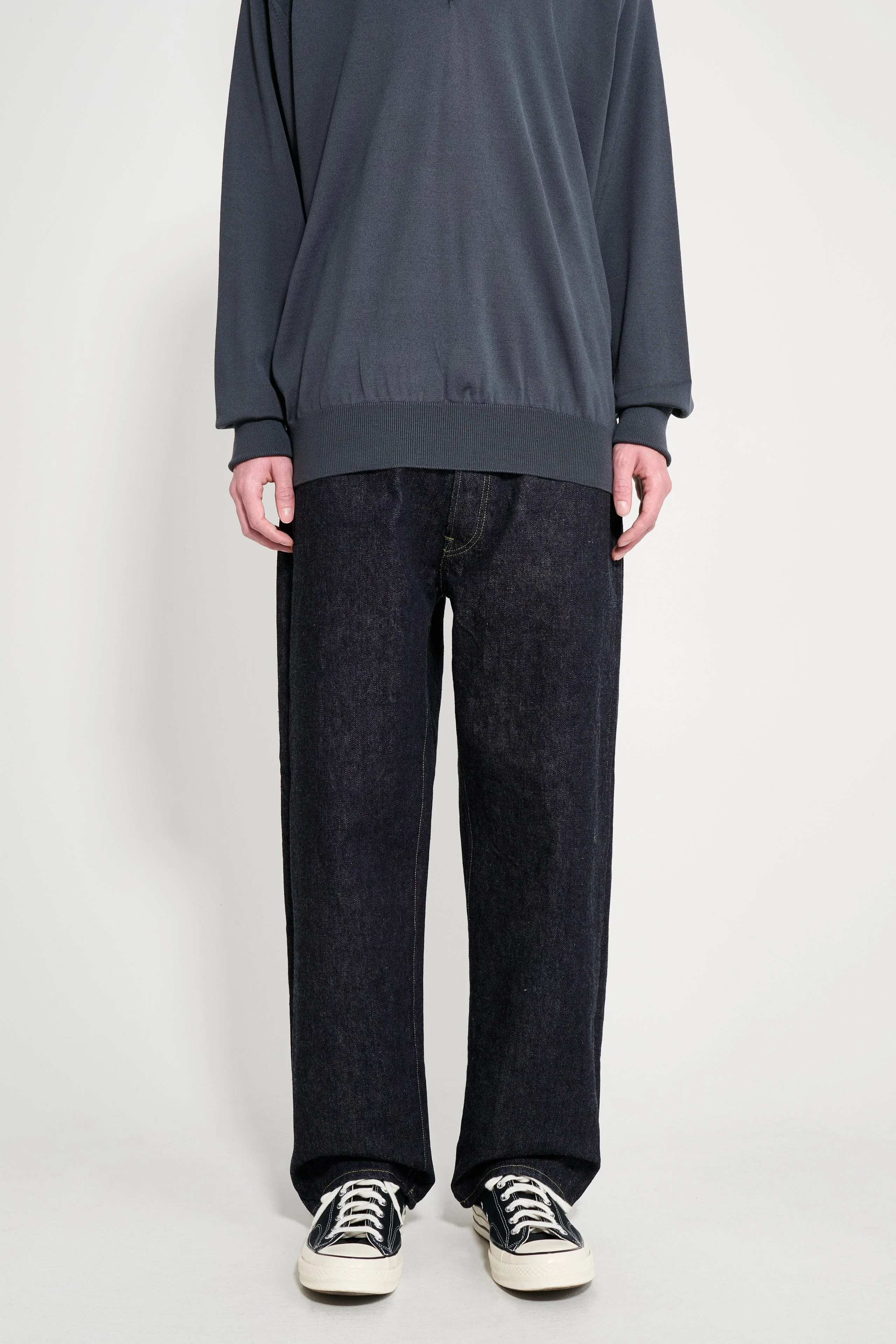Jeans from A.PRESSE. Made in Japan from 13.5oz Kibata selvedge denim. The fabric is woven from low-twist, high-nep yarn with visible cotton leaf residue, reproducing the natural irregularities of early denim designs. Features 5-pocket styling, belt loops, and a button closure. Designed with archival details, including belt loop width, placement, and rivet positioning. Finished with a one-wash process for a mint-condition appearance rarely seen in vintage denim. Each pair varies slightly in texture and tone, and original copper rivets may darken or develop patina over time. Details Dark blue denim pants. Made in Japan from 100% cotton.ART. NO: AP-4001 Size & fit Length 30. Model wears a size 32 and measures 184 cm with a 60 cm waist.