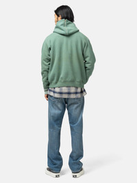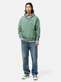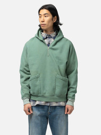 The A.PRESSE Sailor Hood Half Zip Sweatshirt revisits vintage workwear with careful attention to proportion and detail. Its short, rounded silhouette is created by a seamless shoulder construction, while moderately cut sleeves offer ease for layering. Crafted from semi-brushed yarns analyzed from archival garments, the outer thread is slightly thicker and the inner brushed for a soft, lived-in hand. Hand-applied finishing introduces subtle color irregularities and surface marks, giving each piece a unique, timeworn character that reflects traditional craftsmanship. DETAILS - 26SAP-05-13 - 100% Cotton - Hand dyed and processed - Fading and distressing treatment - Relaxed fit - Rounded silhouette - Half-zip opening - Ribbed hem and cuffs - Kangaroo hand pockets - Made in Japan