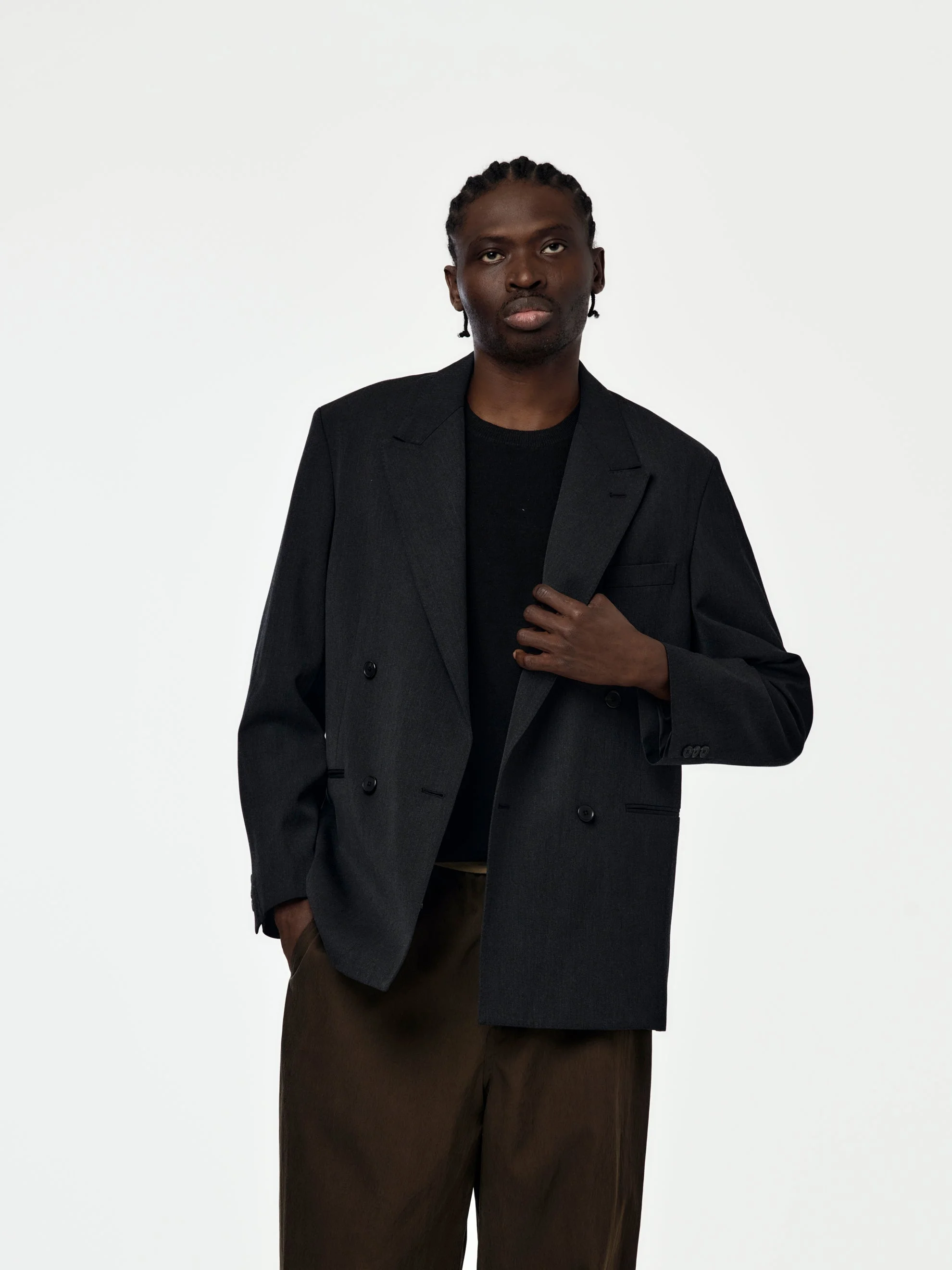 A.PRESSE builds a classic double-breasted blazer with subtle structure and a relaxed drape. The charcoal wool adds depth and texture, creating a timeless jacket that moves between tailored and casual with ease. SKU: 25AAP-01-32