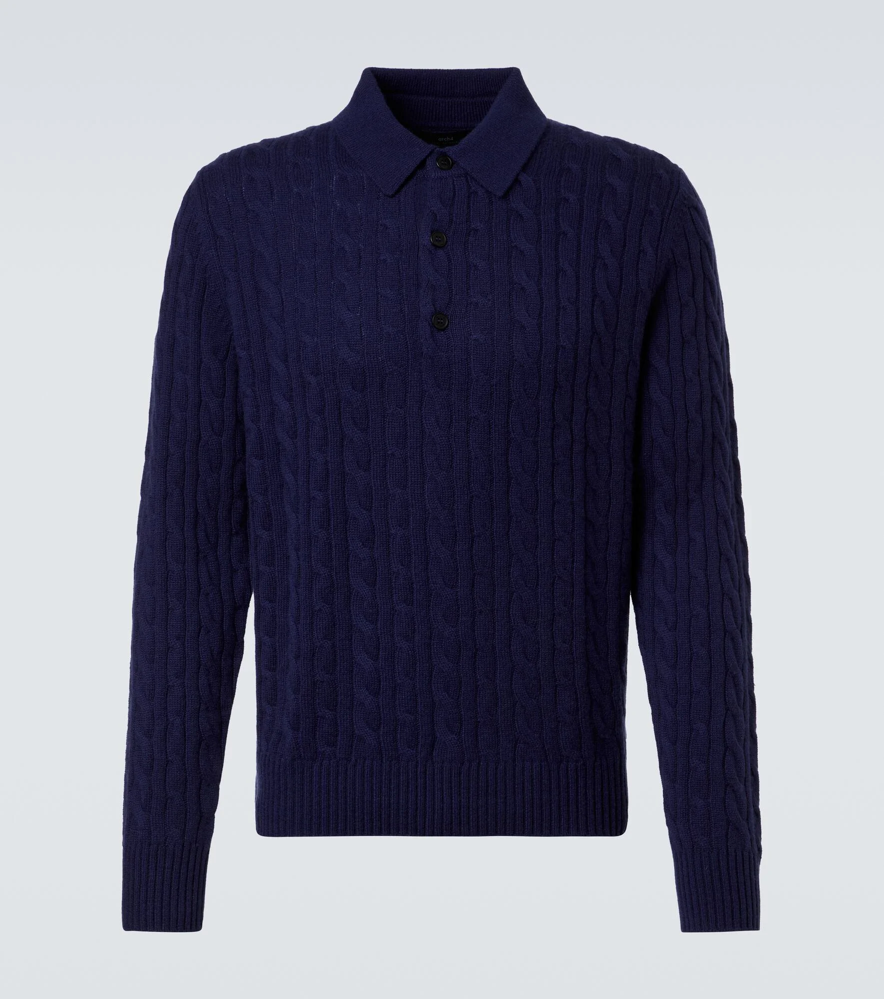 Crafted from soft cashmere in a classic cable-knit, this Arch4 sweater is finished with a crewneck, ribbed cuffs, and hem. A timeless wardrobe staple, this style exudes effortless elegance and ease. Product Details - Material: 100% cashmere - Care instructions: dry clean - Made in the UK - Color: blue - Designer color name: Ody - Item color: blue - Collar: polo collar - Closure: partially buttoned front - Hem: ribbed - Cuff: ribbed - Item number: P01144533 Size & Fit - True to size - Straight fit - Slightly stretchy fabric - Falls to the hip - Height of model is 192cm-75.5" and wears a size L