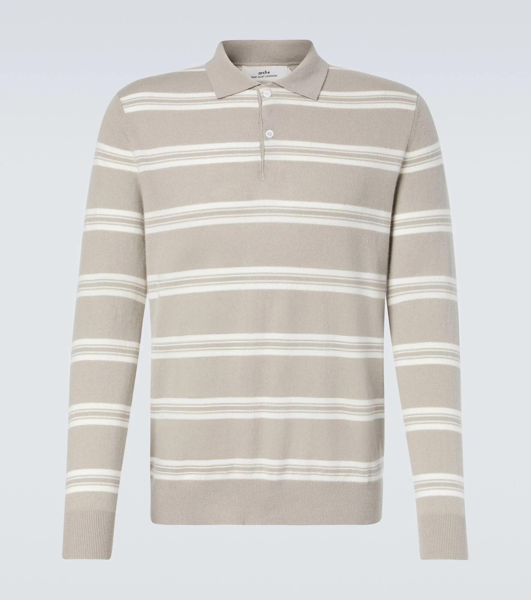 The Mr Swansea polo sweater by Arch4 finishes every look with preppy charm with its striped pattern. Crafted from pure cashmere, the design features a classic collar with a half-buttoned front and a relaxed silhouette. Product Details - Material: 100% cashmere - Care instructions: dry clean - Made in China - Designer color name: Lichen - Item color: beige - Collar: polo collar - Closure: partially buttoned front - Hem: ribbed - Cuff: ribbed - Item number: P01077085 Size & Fit - True to size - Straight fit - Slightly stretchy fabric - Falls to the hip - Height of model is 189cm-74.5" and wears a size L
