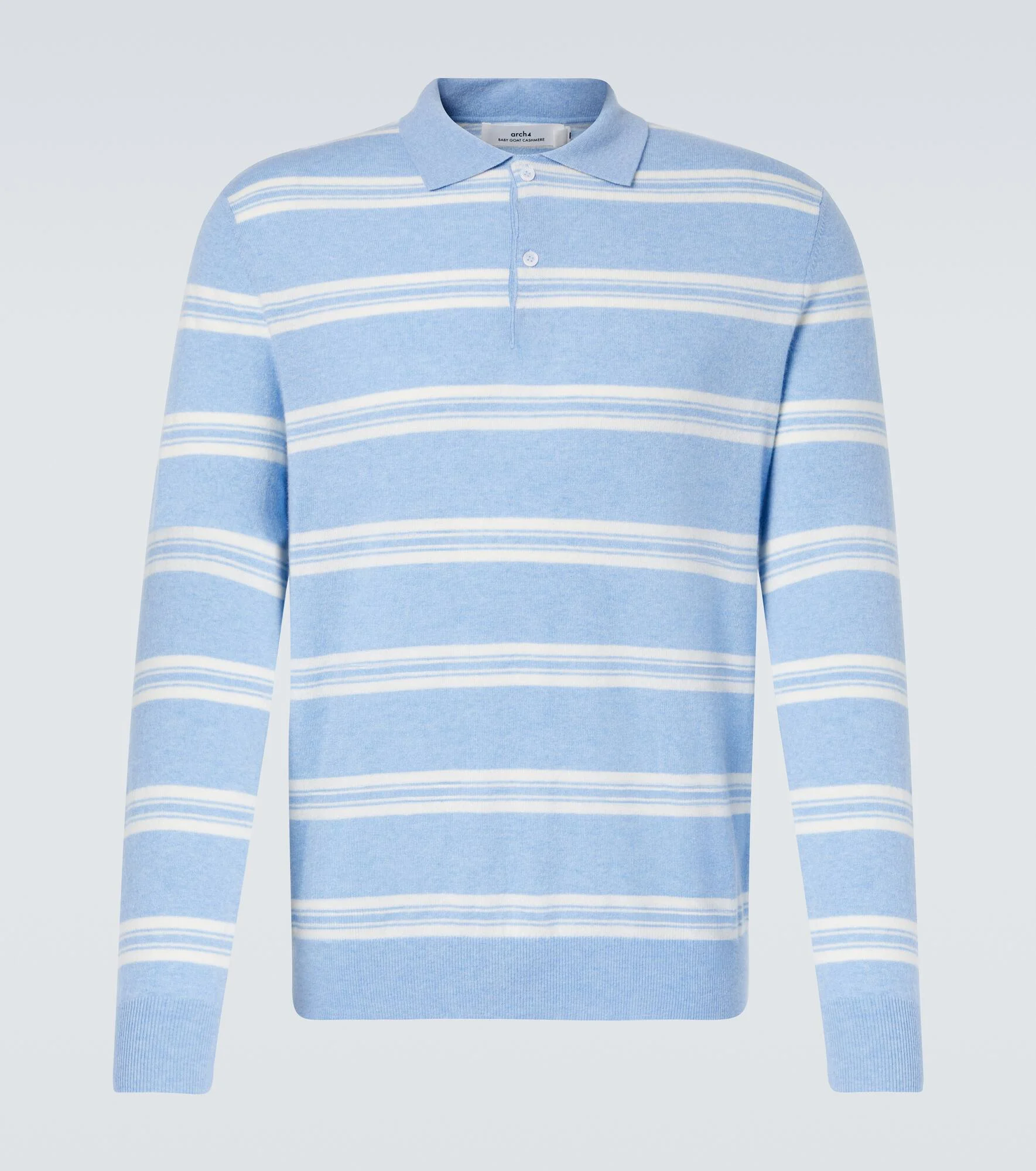 The Mr Swansea polo sweater by Arch4 finishes every look with preppy charm with its striped pattern. Crafted from pure cashmere, the design features a classic collar with a half-buttoned front and a relaxed silhouette. Product Details - Material: 100% cashmere - Care instructions: dry clean - Made in China - Designer color name: Sky Melange - Item color: blue, white - Collar: polo collar - Closure: buttoned placket - Cuff: ribbed - Hem: ribbed - Item number: P01077084 Size & Fit - True to size - Straight fit - Slightly stretchy fabric - Falls to the hip - Height of model is 189cm-74.5" and wears a size L
