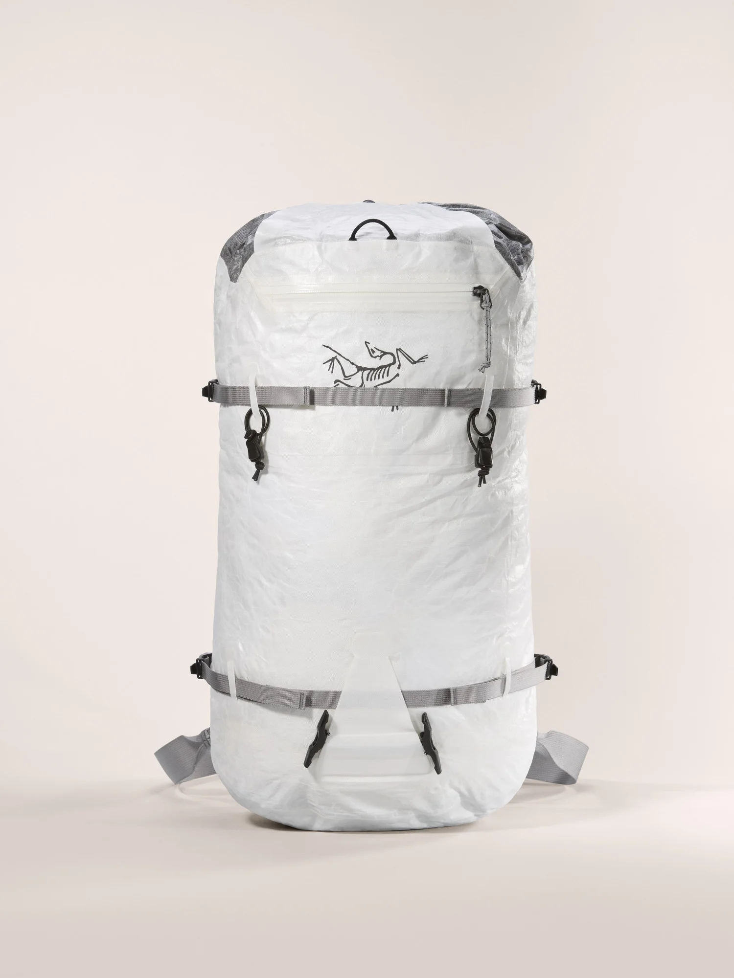 Ultralight, ultra-durable 30L pack for rock, ice, and alpine climbing. Lighter’s faster, and with the Alpha 30L pack, it’s stronger, too. Tough enough for rock, ice, and alpine climbing, our unique ALUULA Graflyte™ fabric fuses ultralight, ultra-strong polymer films to create a single material with unrivaled tear strength — and a pack that weighs next to nothing, so all you’ll feel is the weight of your gear. Full Product Features Technical features - Lightweight - Highly durable - Water resistant Construction - Aluula pack fabric’s unique construction layers ultralight, ultra-strong polymer films in a patented fusion process to create a single material delivering unrivaled tear strength for exceptionally little weight Logos & Label configuration - Arc'teryx Bird logo Pack attachment configuration - Six integrated front lash points let you customize external carry - Dual dog-bone tool attachments Pack dimensions - Length: 55cm, Width: 27cm, Depth: 17cm, Volume: 30L Pack lid configuration - Integrated mini-lid automatically flips to cover access portal when closed to protect contents and provide a secure rope carry Pack loading & Closure configuration - Pull-to-open / pull-to-close drawcord main compartment for easy access Pack pocket configuration - External WaterTight™ zippered pocket with key clip Pack suspension configuration - Lightly padded thermoformed shoulder straps are durable, light, and comfortable - Thermoformed back panel provides support, structure, and a comfortable carry Snowsport features - RECCO® reflector aids search and rescue in emergency situations Sustainability - PFAS (Per- and polyfluoroalkyl substances) Compliant Materials - Body: 200d Weave, LDPE soft V-Film lamination on the back, A-film durable outer film on the face, 130gsm - 100% Polyethylene - Contrast: 50d Plain Weave, LDPE soft V-Film lamination on the back, 52gsm - 100% Polyethylene - Origin of fabric: CANADA - Origin of dyeing: CANADA - May release plastic microfibres into the environment when washing