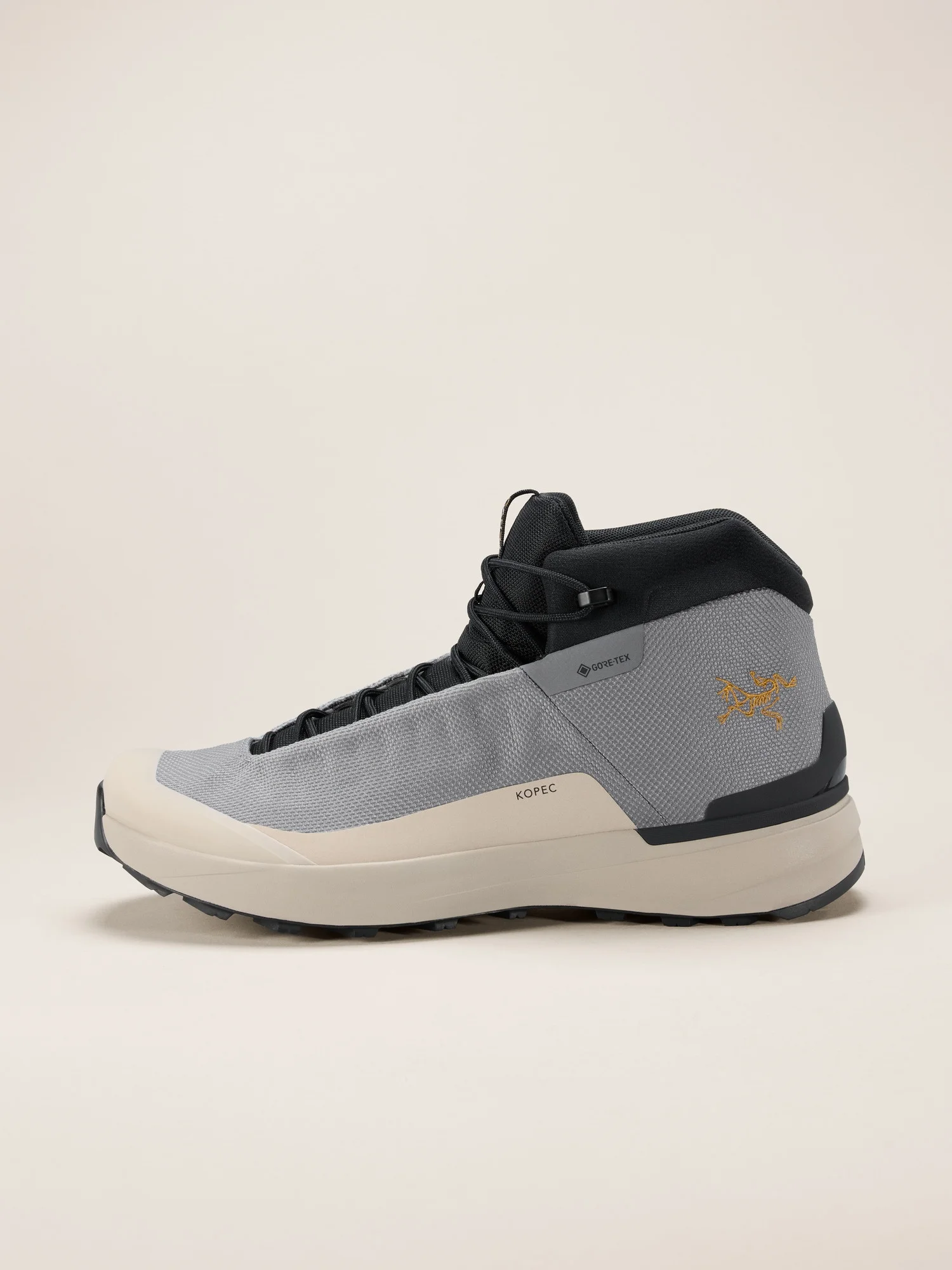 Waterproof mid-height hiking shoe for fast and light travel on shifting terrain. Agile and light, supportive and comfortable – the Kopec Mid GTX is the all-season hiker for confident travel on varied terrain. Made for day hikes and minimalist multiday treks, its PFAS-free GORE-TEX protection seals out water and snow. The CORDURA mesh upper is durable and light, a moulded pad protects your ankle, and the wide toe box gives you room to splay. Cushioning and support come from the dual-density midsole, and the Vibram Megagrip outsole and custom lug pattern deliver a secure grip. Full Product Features Technical features - Waterproof - Breathable Footwear construction - Articulated Ultralon® 3D moulded collar and tongue combine support and protection with exceptional agility, fit, and freedom - Dual-density midsole material and construction combine cushioning with lasting shock absorption and support for all-day comfort and stability on rugged terrain - Specially designed TPU midfoot shank offers torsional support and underfoot protection for minimal weight - Extended U-throat construction provides more flex, better breathability, greater comfort - Waterproof, breathable GORE-TEX ePE fabric protection with a reduced carbon footprint - Highly durable CORDURA® mesh upper delivers lightweight, breathable, quick-drying performance - Moulded malleolus pad protects the ankle - Roomy toe box accommodates splay and protects toes - Lacing system utilizes integrated webbing with durable metal eyelets at the top to create a secure, supportive, comfortable fit - Asymmetric molded TPU toe cap and reinforcements at high-wear zones add protection and durability - External molded TPU heel counter adds support and protection Footwear geometry - Advanced lug geometry provides precision grip across a range of surfaces, sheds mud, and promotes an easy stride Footwear outsole construction - Vibram® Megagrip outsole with LITEBASE technology delivers durable, surefooted performance across a range of conditions while shedding every gram possible Sustainability - PFAS (Per- and polyfluoroalkyl substances) Compliant Materials - Lining: Textile - Insole: Textile/Synthetic - Outsole: Rubber