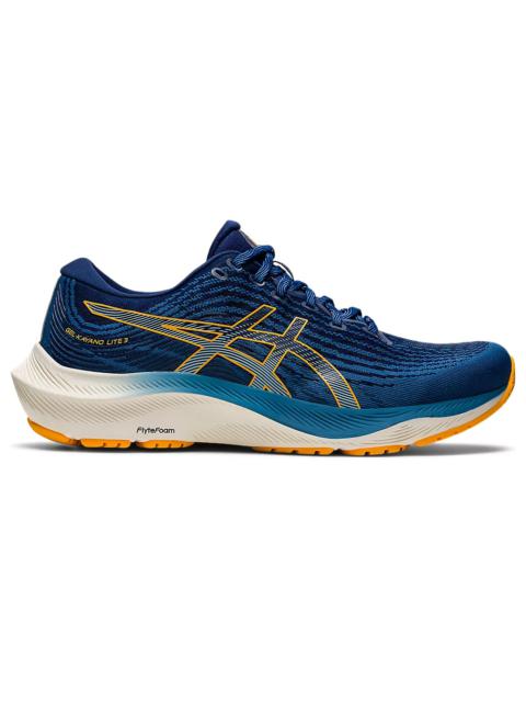 The GEL-KAYANO® LITE 3 running shoe embraces a sound earth. With a greater emphasis on sustainability, this shoe keeps your step stable and your mind light. Its engineered mesh upper is made with a higher percentage of recycled polyester than the previous version. The collar and tongue’s recycled textiles are helping us take additional steps towards lightening our impact on the environment. FLYTEFOAM® cushioning is made from organically derived materials. We added more of this lightweight foam in the forefoot to create a more energetic rebound at toe-off. The 3D SPACE CONSTRUCTION™ feature addresses the gait differences of male and female runners. It's designed to reduce overpronation, which keeps your foot supported. Style #: 1011B463.020 UPC #: None Tech & Materials At least 50% of the shoe’s main upper material is made with recycled materials to reduce waste and carbon emissions AHAR™ heel plug Improves the outsole durability. The sockliner is produced with the solution dyeing process that reduces water usage by approximately 33% and carbon emissions by approximately 45% compared to the conventional dyeing technology Breathable jacquard mesh upper GEL™ technology cushioning Provides excellent shock absorption. FLYTEFOAM™ cushioning consists of cellulose nanofiber, a bio-based material applied as a component of this shoe's midsole Reflective details Help improve visibility in low-light settings. 3D SPACE CONSTRUCTION™ feature Improves compression at footstrike. OrthoLite™ lasting Improves step-in comfort and durability. GUIDANCE LINE™ technology Improves gait efficiency.