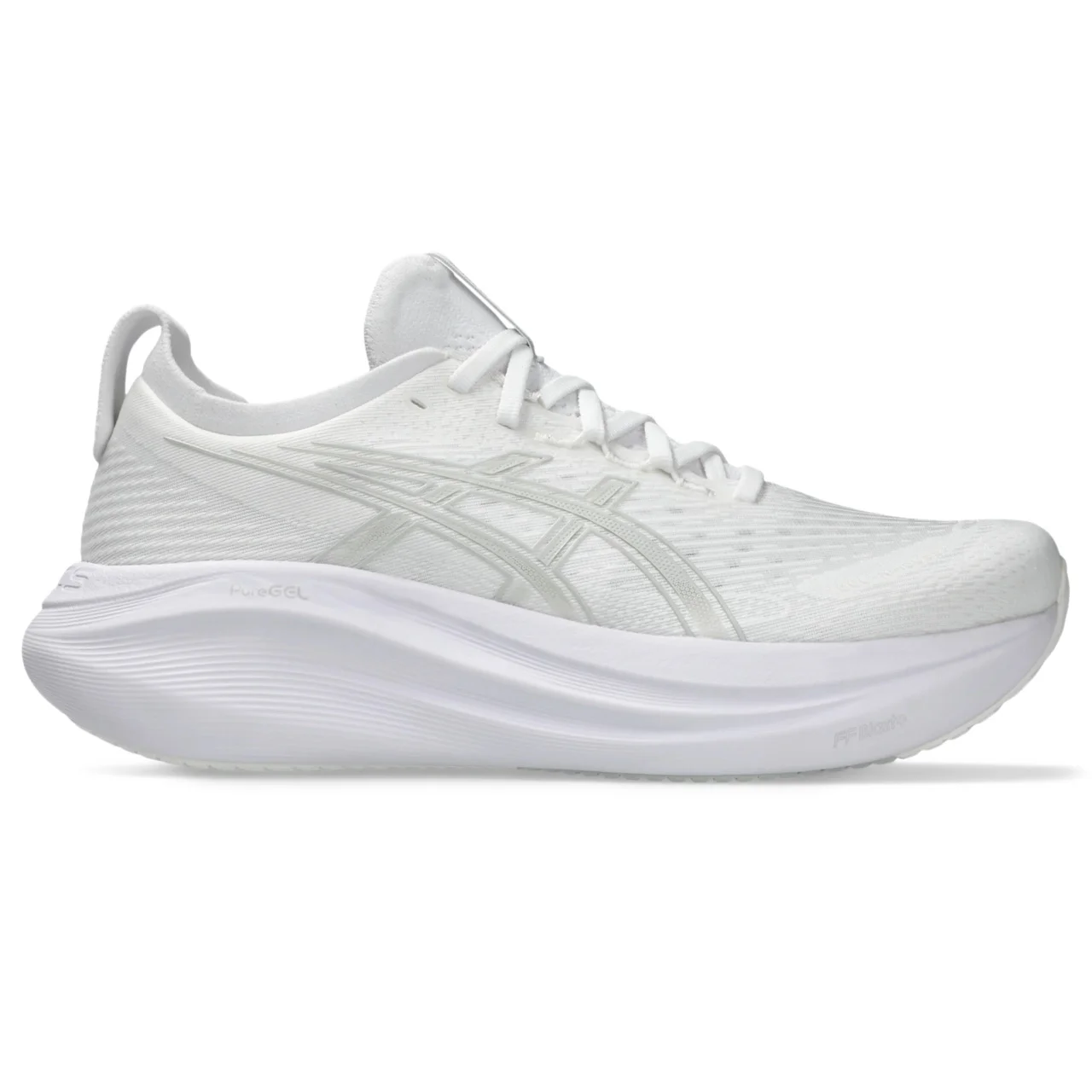 The GEL-NIMBUS® 27 shoe's soft cushioning properties help you feel like you're landing on clouds. This design is revamped to help create a softer and smoother running experience. A soft engineered jacquard mesh upper comfortably wraps your foot while supplying advanced ventilation. Additionally, the knit tongue and collar help provide a soft and supportive feel. By using FF BLAST™ PLUS ECO cushioning, this trainer creates a lighter and softer cushioning experience. Lastly, HYBRID ASICSGRIP™ outsole rubber helps create better traction, improved softness, and advanced durability. Style #: 1011B958.100 UPC #: None Tech & Materials Engineered jacquard mesh upper Wraps the foot with a soft feel At least 75% of the shoe's main upper material is made with recycled content to reduce waste and carbon emissions The sockliner is produced with the solution dyeing process that reduces water usage by approximately 33% and carbon emissions by approximately 45% compared to the conventional dyeing technology PureGEL™ technology Helps provide lightweight cushioning and softer landings FF BLAST™ PLUS ECO cushioning made with approximately 24% bio-based content using renewable sources creating a softer landing and a more responsive toe-off OrthoLite™ X-55 sockliner Improves step-in comfort Reflective details Designed to improve visibility in low-light conditions HYBRID ASICSGRIP™ outsole rubber Helps create better traction, improved softness, and advanced durability