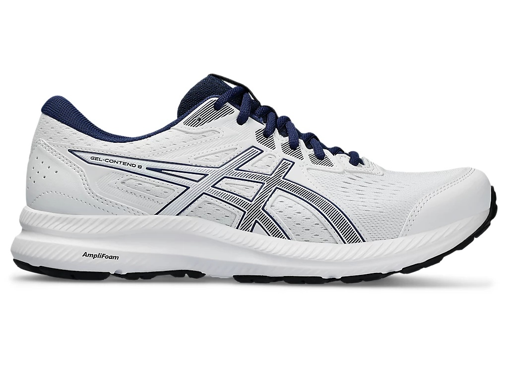 The GEL-CONTEND® 8 running shoe provides good cushioning, support, and durability. A jacquard mesh upper stretches with the foot's natural motion and creates a comfortable fit. Meanwhile, the synthetic stitching on the overlays helps create a more supportive foothold. The midsole features GEL® technology and AMPLIFOAM™ cushioning. These technologies help increase durability while creating a softer feel underfoot. Style #: 1011B492.104 UPC #: 197298178365 Tech & Materials Rearfoot GEL® technology cushioning improves impact absorption and creates a softer feeling at footstrike Jacquard mesh upper improves airflow OrthoLite™ sockliner offers excellent step-in comfort Flex grooves in the outsole improve flexibility Synthetic stitching on the overlays improves support AMPLIFOAM™ cushioning helps improve durability GUIDANCE LINE® technology provides a more consistent stride At least 20% of the shoe’s main upper material is made with recycled materials to reduce waste and carbon emissions The sockliner is produced with the solution dyeing process that reduces water usage by approximately 33% and carbon emissions by approximately 45% compared to the conventional dyeing technology