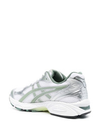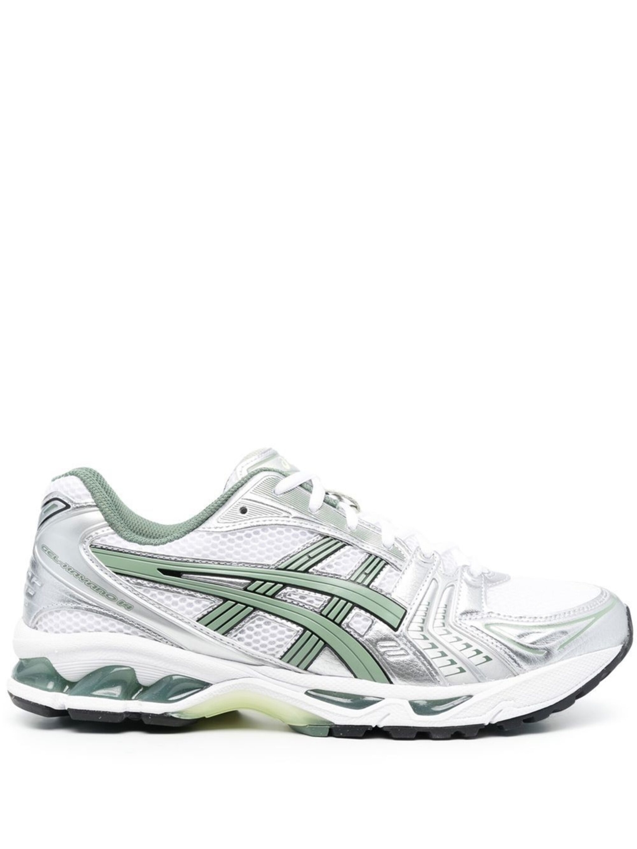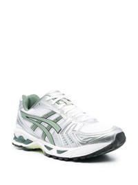 GEL-Kayano 14 low-top sneakers from ASICS featuring grey/white, green, panelled design, side stripe detailing, mesh detailing, round toe, front lace-up fastening, chunky rubber sole and branded insole. Size & Fit HEEL: 4.5cm Sole height: 2.5cm Fabric and Care Designer Style ID: 1201A019 Designer Colour: 107 WHITE SLATE GREY Composition: Sole: Rubber 100%; Outer: Calf leather 100%, Fabric 100%; Lining: Fabric 100%Made in Vietnam