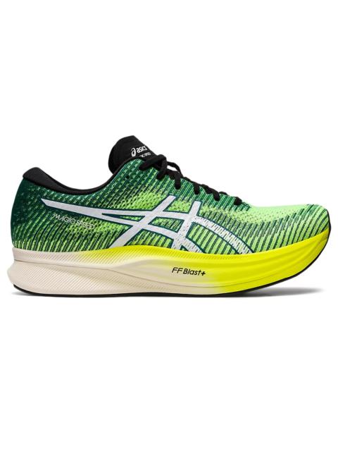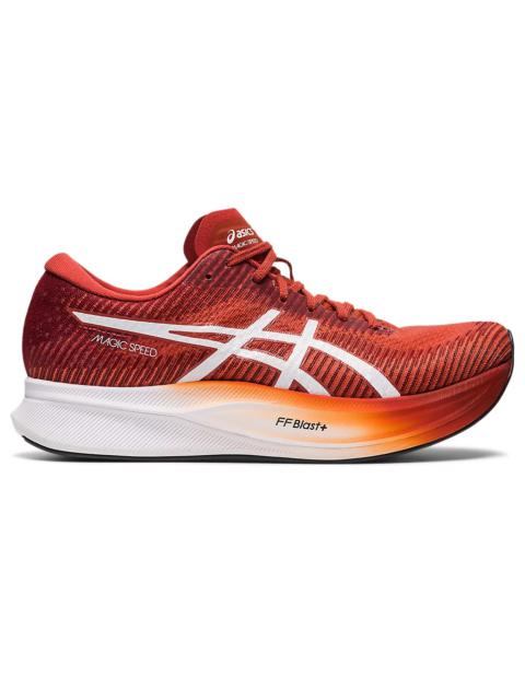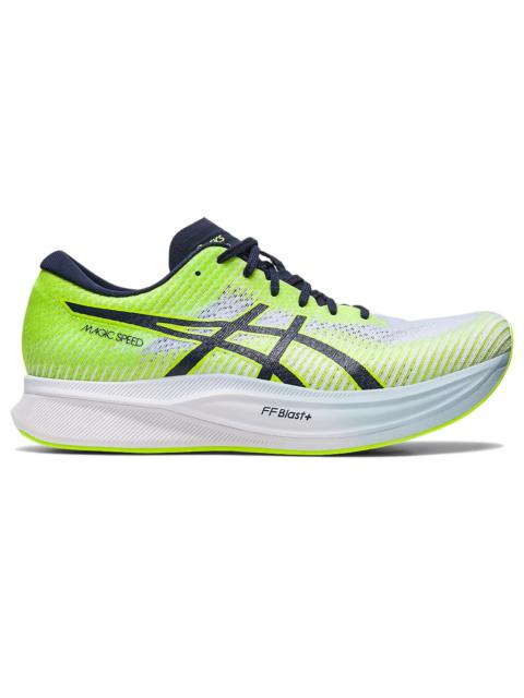 The MAGIC SPEED™ 2 shoe offers the energy you need to move towards a new personal best. We updated the fit and tooling to make the shoe more versatile for both tempo runs and races. A full-length carbon and TPU plate are sandwiched in the midsole to propel your foot forward. This helps create a smoother and more propulsive rebound during the toe-off phase of your stride. The midsole's top layer is reconstructed with FF BLAST™ PLUS cushioning. It helps your stride feel even more propulsive while keeping the shoe lightweight. Style #: 1011B443.600 UPC #: 196074744398 Tech & Materials Engineered mesh upper Improves breathability. At least 50% of the shoe’s main upper material is made with recycled materials to reduce waste and carbon emissions The sockliner is produced with the solution dyeing process that reduces water usage by approximately 33% and carbon emissions by approximately 45% compared to the conventional dyeing technology Full-length carbon and TPU plate Add structure and improve toe-off propulsion. FF BLAST™ PLUS cushioning Provides lightweight impact absorption and a responsive rebound. ASICSGRIP™ rubber outsole Improves traction.