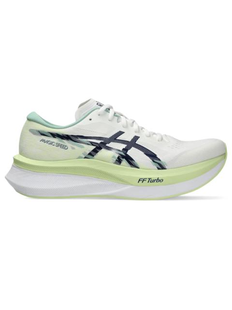 The MAGIC SPEED™ 4 shoe is designed to support your racing goals. In addition to the softer cushioning experience, this shoe helps create better stability throughout your stride. A sculpted carbon plate is designed to help improve stability and propel your foot forward. This helps create a smoother and more propulsive experience during the toe-off phase of your stride. Additionally, this shoe is updated with FF TURBO™ cushioning, which helps you experience a more energetic toe-off during tempo runs and races. Style #: 1011B875.400 UPC #: 197298510424 Tech & Materials Engineered Mesh upper Improves breathability At least 50% of the shoe’s main upper material is made with recycled materials to reduce waste and carbon emissions The sockliner is produced with the solution dyeing process that reduces water usage by approximately 33% and carbon emissions by approximately 45% compared to the conventional dyeing technology Full-length carbon plate Adds structure and improve toe-off propulsion FF BLAST™ TURBO cushioning Our lightest and bounciest cushioning material that's 33% lighter and 13% more responsive than FF BLAST™ cushioning ASICSGRIP™ rubber outsole Improves traction