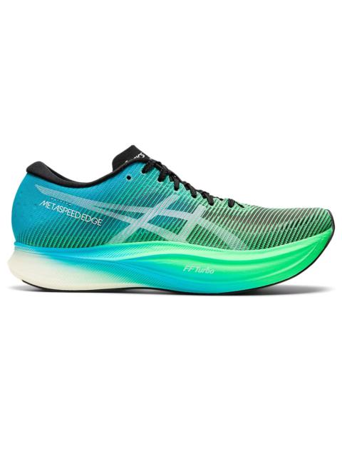 The METASPEED™ EDGE+ racing shoes are designed for cadence-style runners who are looking to start fast and finish faster. Runners wearing these shoes will be able to take longer strides while conserving energy with each step. Thanks to an energetic midsole foam and a propulsive carbon plate, runners wearing these shoes will be able to conserve more energy while maintaining their pace at the later stages of the race. Style #: 1013A116.100 UPC #: 197298132398 Tech & Materials Jacquard mesh upper improves breathability FF BLAST™ TURBO cushioning improves compression and creates a responsive feel underfoot Curved sole design helps runners conserve more energy in each step Carbon plate guides your foot throughout your step and propels your foot forward ASICS®GRIP™ outsole rubber improves durability and grip At least 50% of the shoe's main upper material is made with recycled content to reduce waste and carbon emissions The sockliner is produced with the solution dyeing process that reduces water usage by approximately 33% and carbon emissions by approximately 45% compared to the conventional dyeing technology