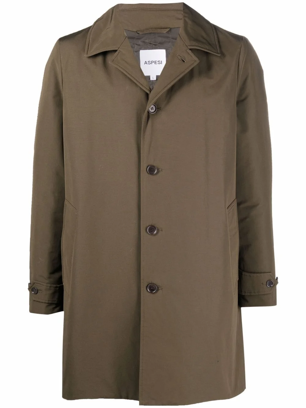 single-breasted tailored coat olive green cotton blend button fastening classic lapels long sleeves Made in Italy Composition Lining: Polyamide 100%, Polyester 100% Outer: Cotton 53%, Polyester 47% SIZE & FIT Model measurements Height 6 ft 1 in(1.86 m) Bust/Chest 35.43 in(90 cm) Hips 35.43 in(90 cm) Waist 29.92 in(76 cm) FittingInformation This piece fits true to size. We recommend you get your regular size Cut for a loose fit Made with a mid-weight non-stretch fabric Washing instructions Dry Clean Only