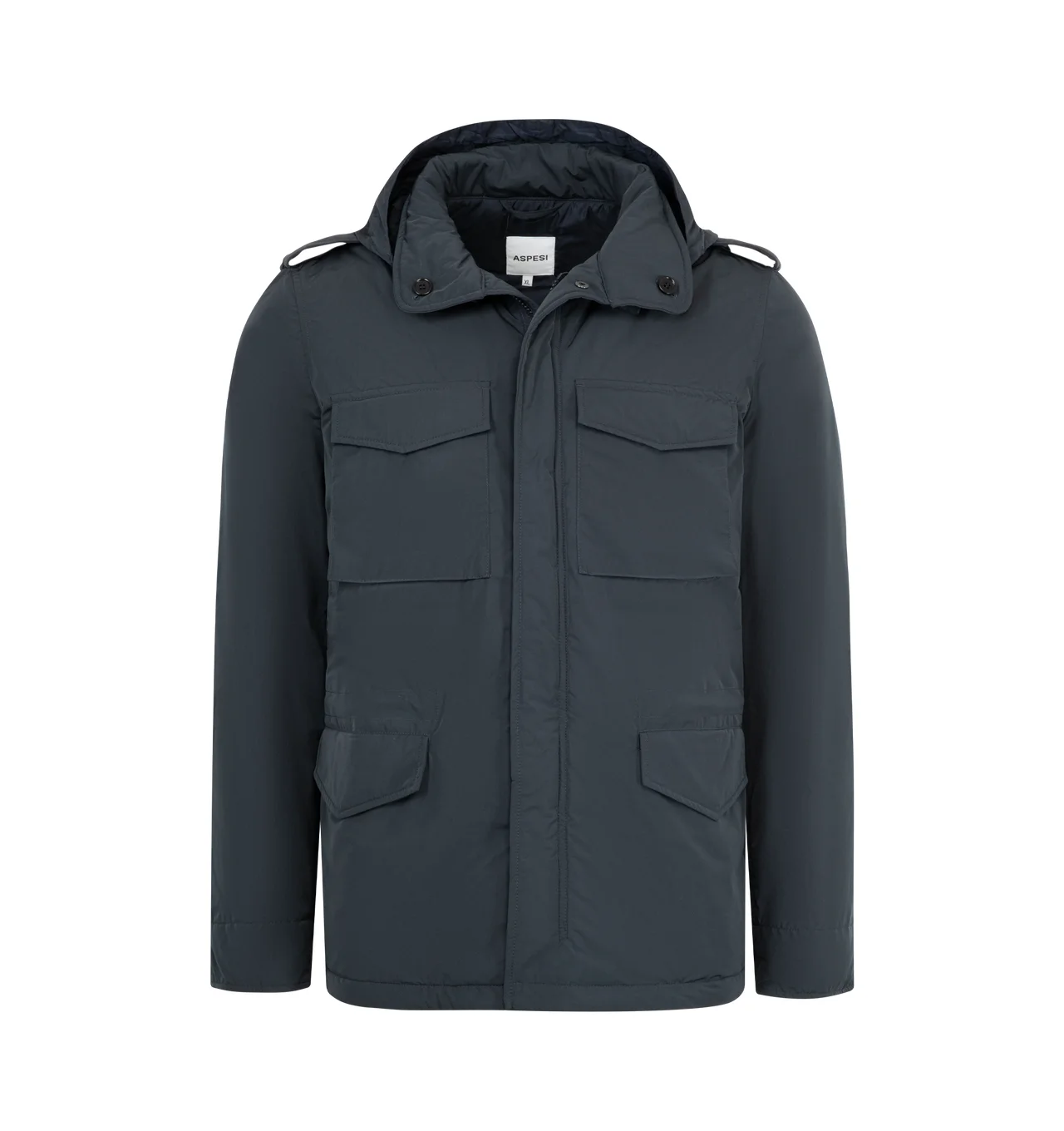ASPESI Mini Field Jacket in nylon taffeta featuring extra-thermal wad padding, detachable fold-away hood, zip plus hidden button fastening and wind flap, waterproof, four patch pockets, drawstring waist, zipper pull branded with the micro-injected Aspesi logo and slim fit. 100% polyamide. DESIGNER STYLE ID: CN-I-2I17-G703 COLOR: 01101 NAVY/NAVY