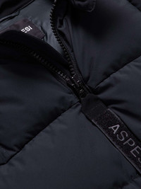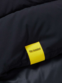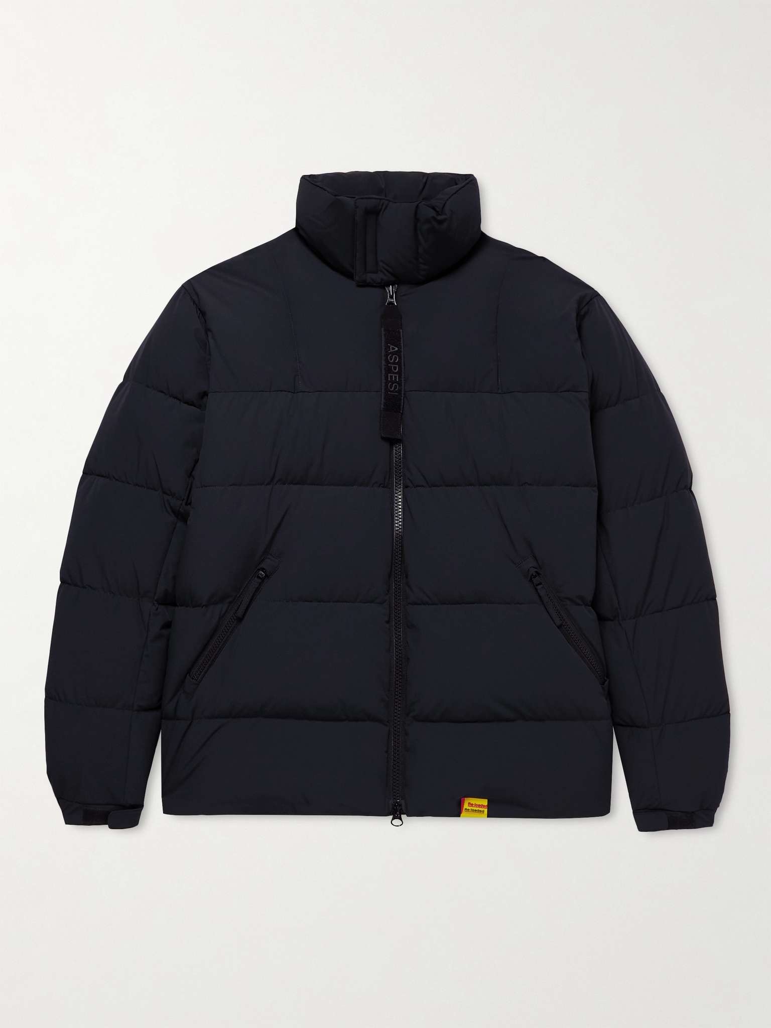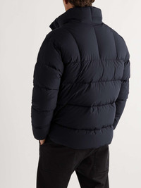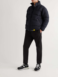 - Navy nylon-blend - Funnel neck with packable hood, chin guard, snap-fastening cuffs, front zipped pockets, appliquéd designer emblem, drawstring hem, fully lined - Two-way zip fastening - 86% nylon, 14% elastane; filling: 90% down, 10% feathers (Duck); lining: 100% nylon - Dry clean