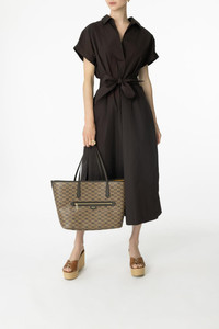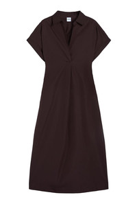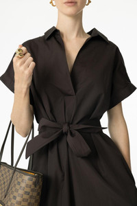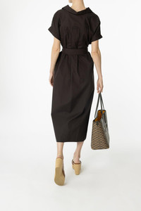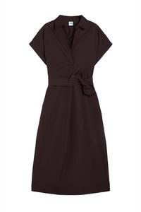 DETAILS AND INSIGHT Aspesi short sleeve belted midi dress in brown. 100% Co Hand Wash Cold Made in IT Style S5_G_2935_D307_85331