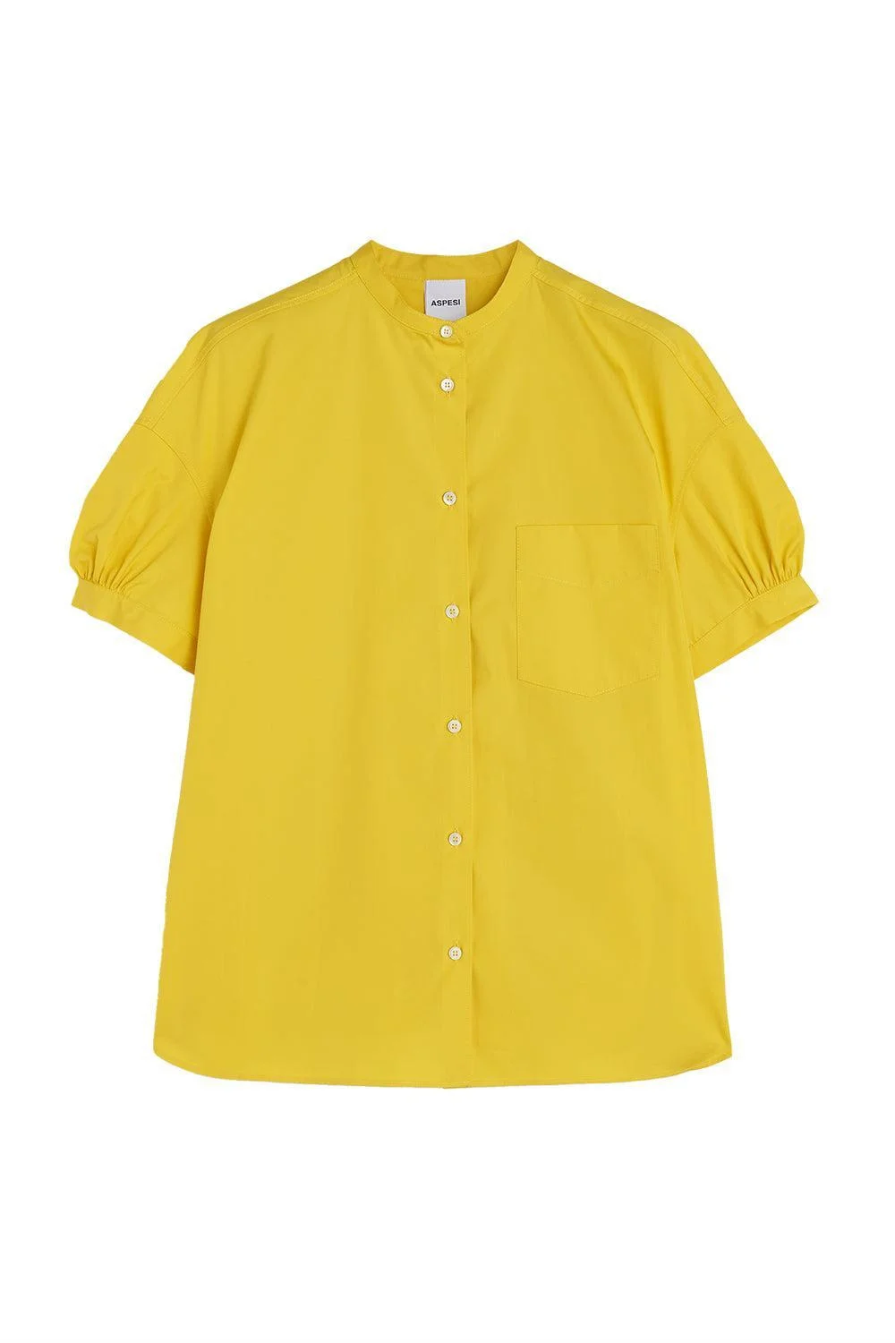 DETAILS AND INSIGHT Aspesi short sleeve button shirt in yellow. 100%Co Hand Wash Cold Made In Ro Style S5_G_5410_D307_85153