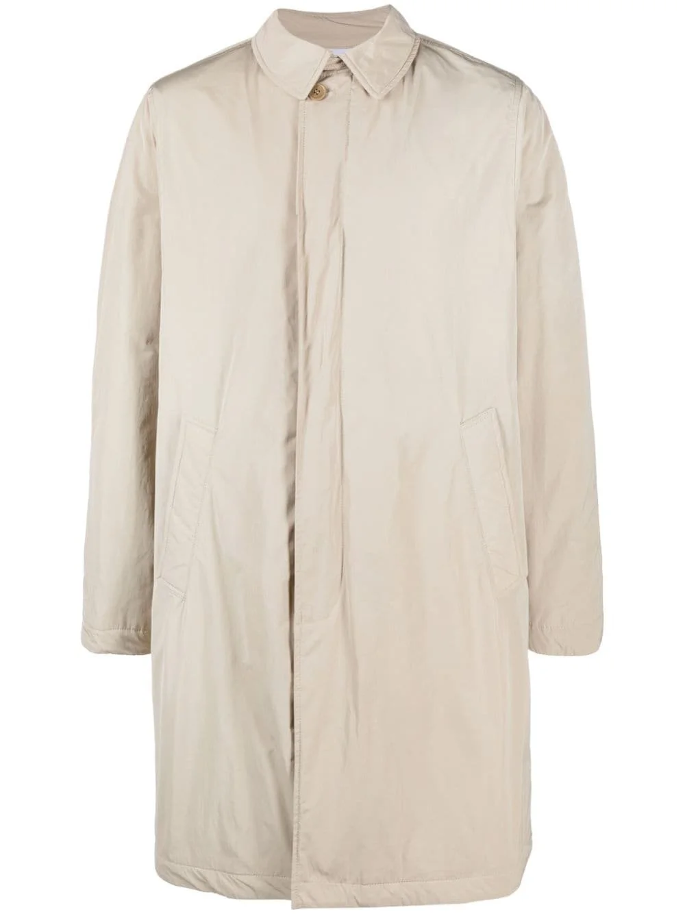 single-breasted padded raincoat Highlights - Light beige - Classic collar - Concealed front fastening - Long sleeves - Buttoned-cuff sleeves - Straight hem - Above-knee length Imported Composition Outer: Polyester 100% Lining: Polyamide 100%, Polyester 100% SIZE & FIT Model measurements Height 6 ft 2 in(1.87 m) Bust/Chest 36.61 in(93 cm) Hips 35.03 in(89 cm) Waist 27.95 in(71 cm) FittingInformation Designed to be unstructured, offering a loose fit throughout The vented hem offers movement at the rear Made from a padded non-stretch fabric, giving it no natural elasticity