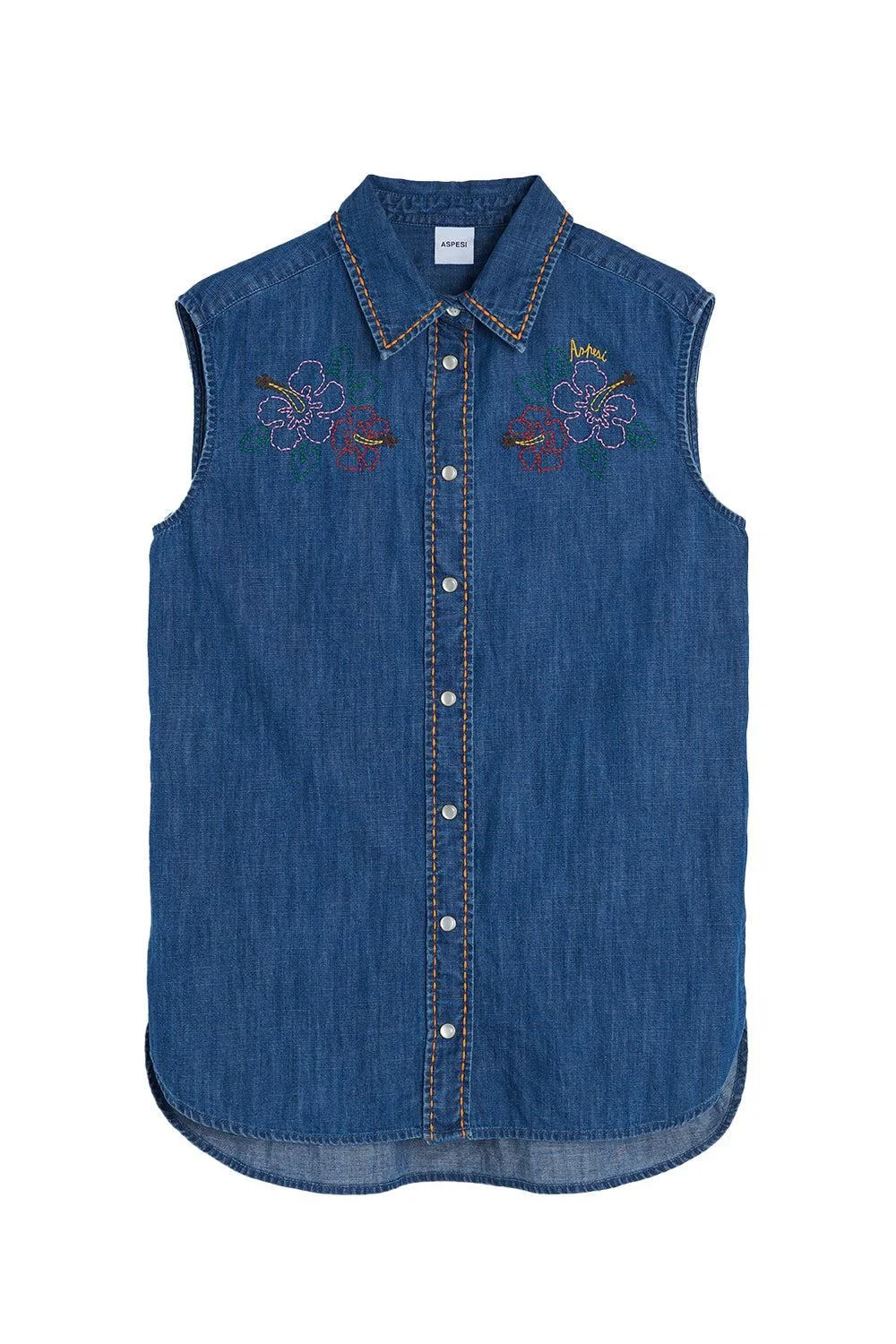 DETAILS AND INSIGHT Aspesi sleeveless embroidered top in denim. 100%Co Hand Wash Cold Made In Imported Style S5_G_5419_L104_OC_60998