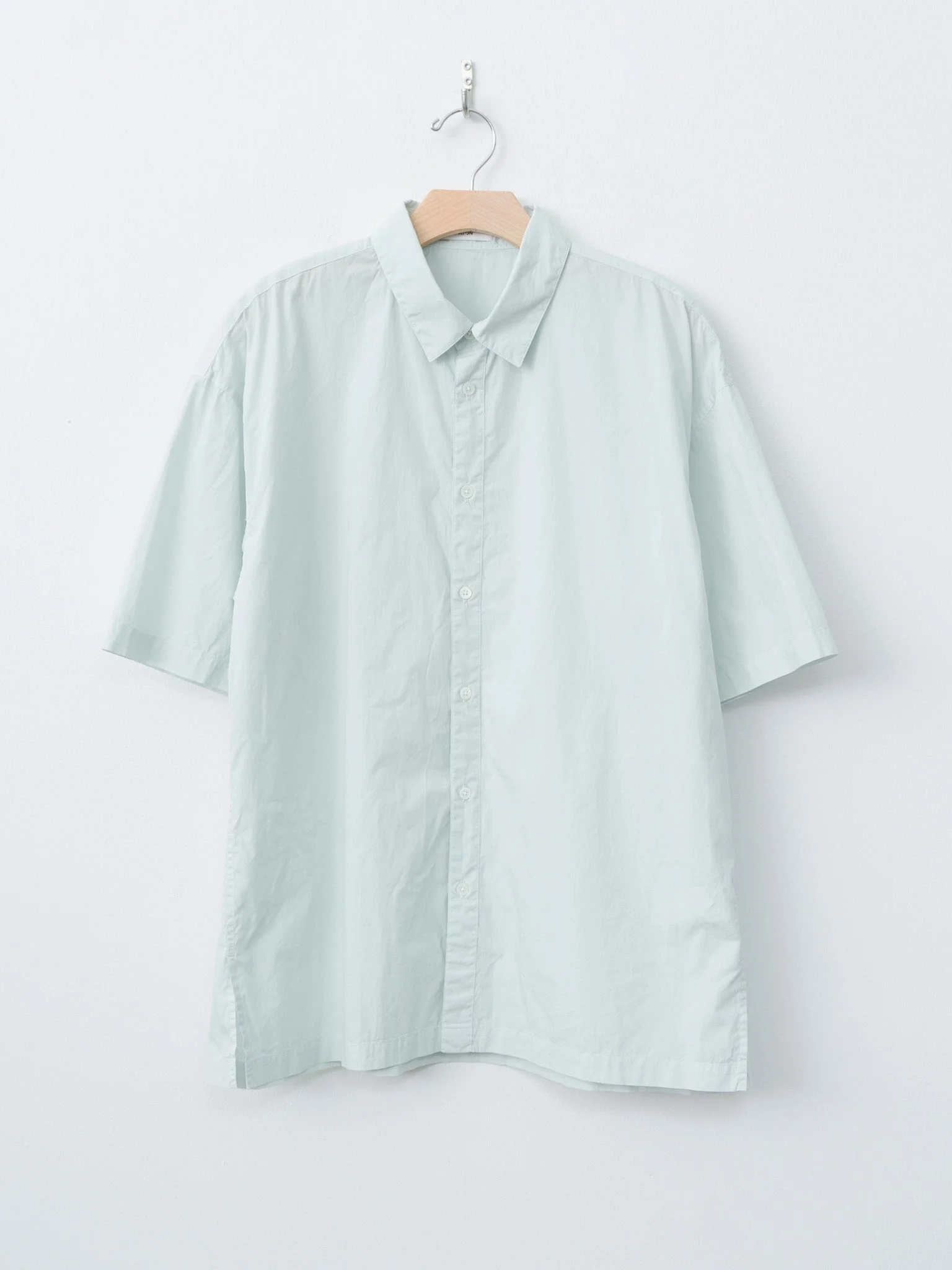 This short sleeve shirt features an oversized silhouette inspired by vintage 3XL proportions, with precise stitching along the seams for a clean, dress shirt-like finish. The fabric is ATON's original cotton lawn that is smooth and very light, made from fine-count American Supima cotton and then garment dyed to bring out the natural fullness of cotton. Details include a regular collar and straight hem with side splits. - Made in Japan - 100% Cotton - Available in Ice Blue, Navy - The model is 5'7"/170cm and wears size 4/M
