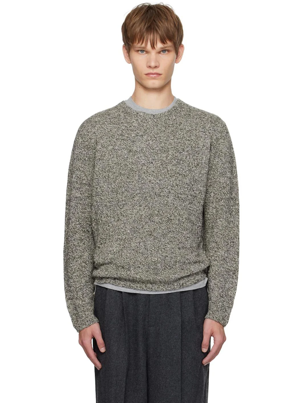 Knit wool- and silk-blend sweater. · Lightweight · Marling throughout · Rib-knit crewneck, hem, and cuffs Supplier color: Top black 57% wool, 43% silk. Made in Japan 252484M201004