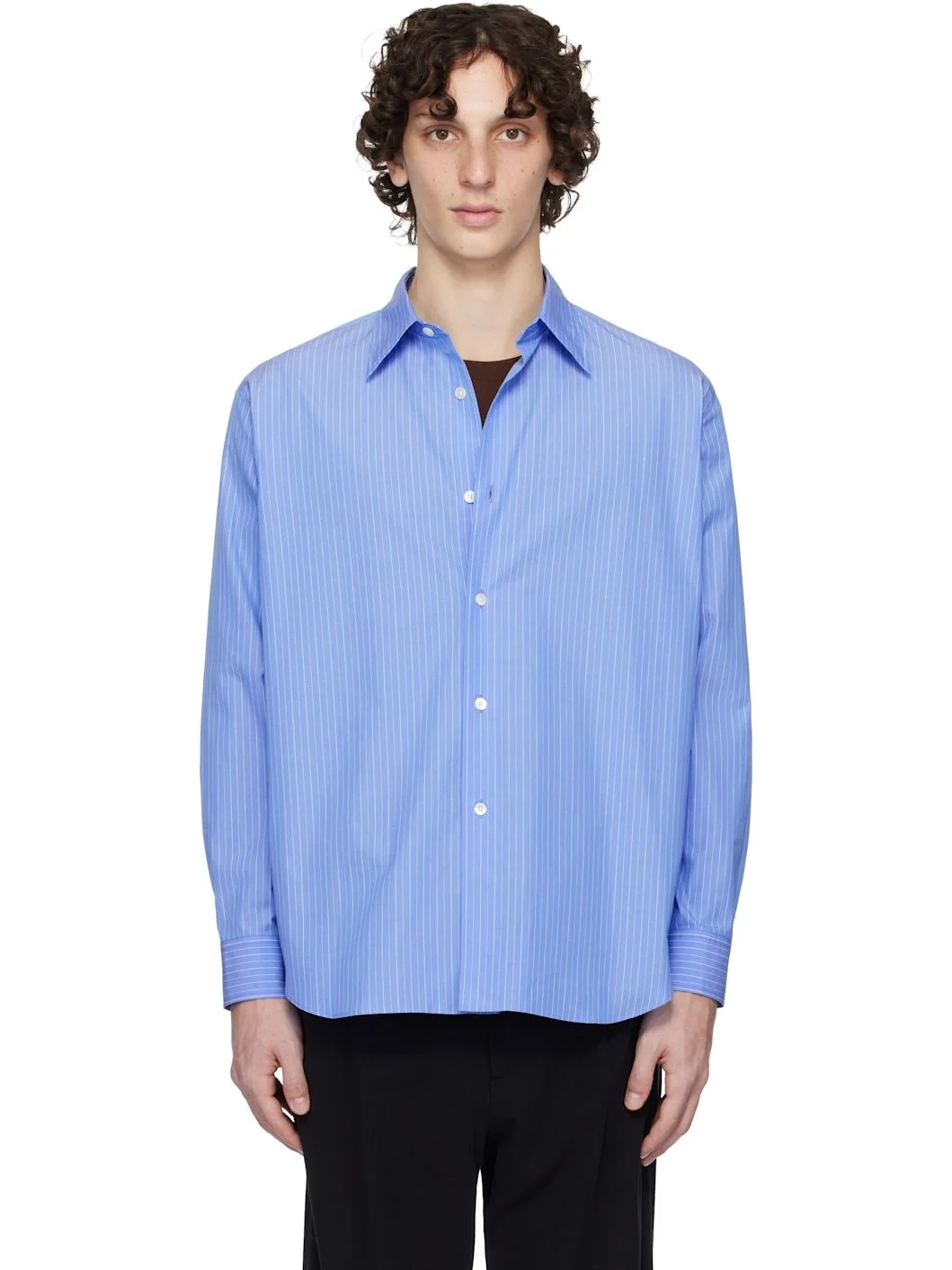 Suvin cotton broadcloth shirt. Stripes throughout. · Spread collar · Button closure · Shirttail hem · Buttoned barrel cuffs · Pleats at back yoke Supplier color: Blue stripe 100% cotton. Made in Japan 252484M192006