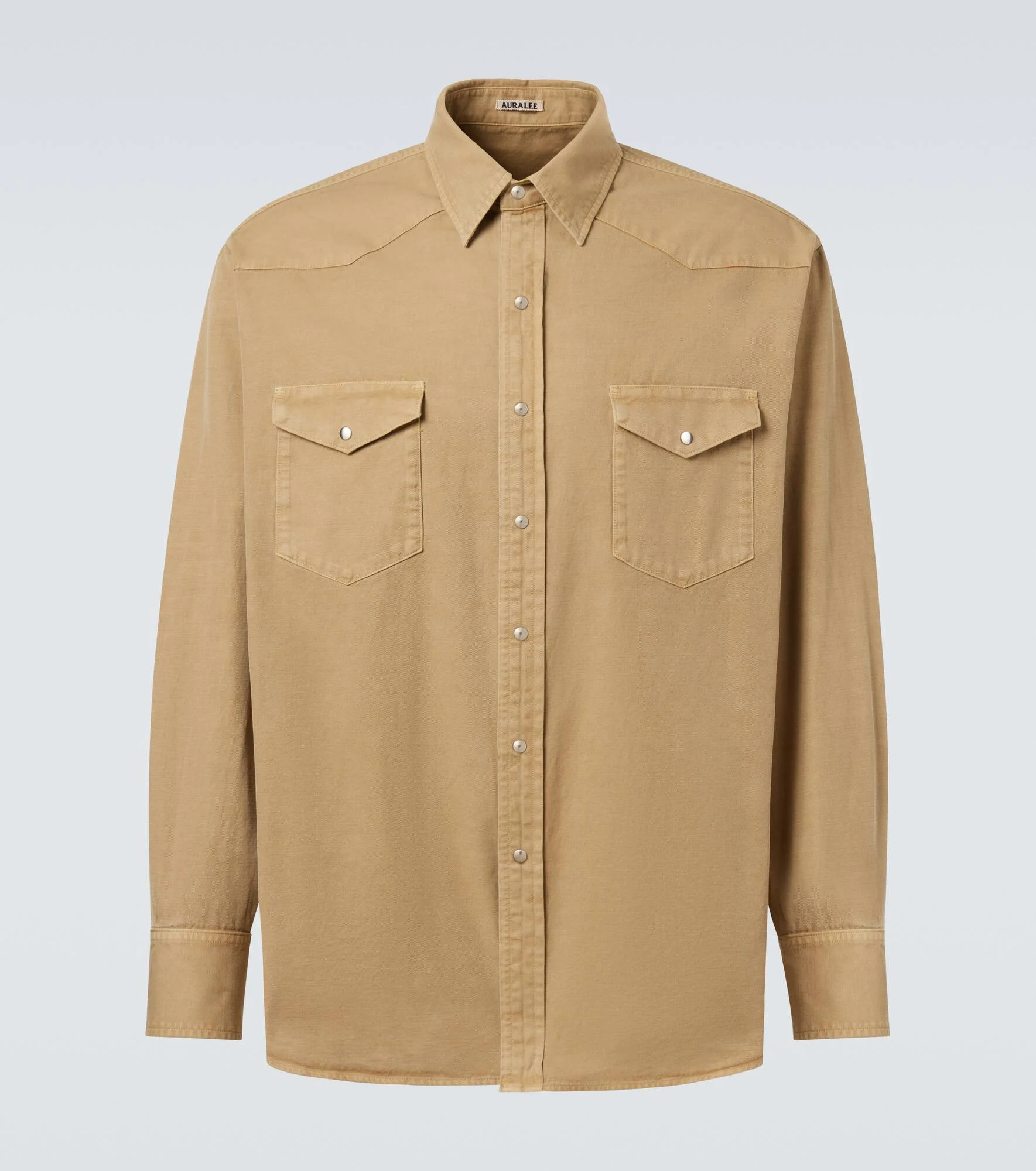 Crafted from soft cotton gabardine, this shirt from Auralee features an effortless, relaxed silhouette with buttoned front closure. The design is complete with a pointed collar and snap button chest pockets. Product Details - Material: 100% cotton - Care instructions: machine wash at 40 degrees - Made in Japan - Designer color name: Dyed Beige - Item color: beige - Closure: snap-buttoned fastenings - Pockets: flap chest pockets - Cuff: buttoned - Collar: classic (Straight point) - Item number: P01029199 Size & Fit - True to size - Dropped shoulders - Without pleats in the back - Regular fit - Non-stretchy fabric - Falls below the hip - Height of model is 189cm-74.5" and wears a size 4