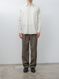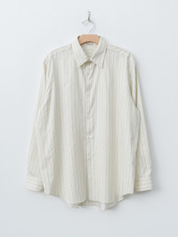 A relaxed fit shirt made from a high-density cotton-silk stripe fabric woven with finely spun extra-long staple Giza cotton blended with silk. It features a cool, smooth surface with natural suppleness and a soft hand. Features a subtle stripe pattern, a curved hem, buttoned cuffs, rear side pleats, and a softly finished drape. - Made in Japan - 73% Cotton, 27% Silk - Available in Ivory Stripe - The model is 6'1"/185cm and wears size 4/M