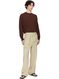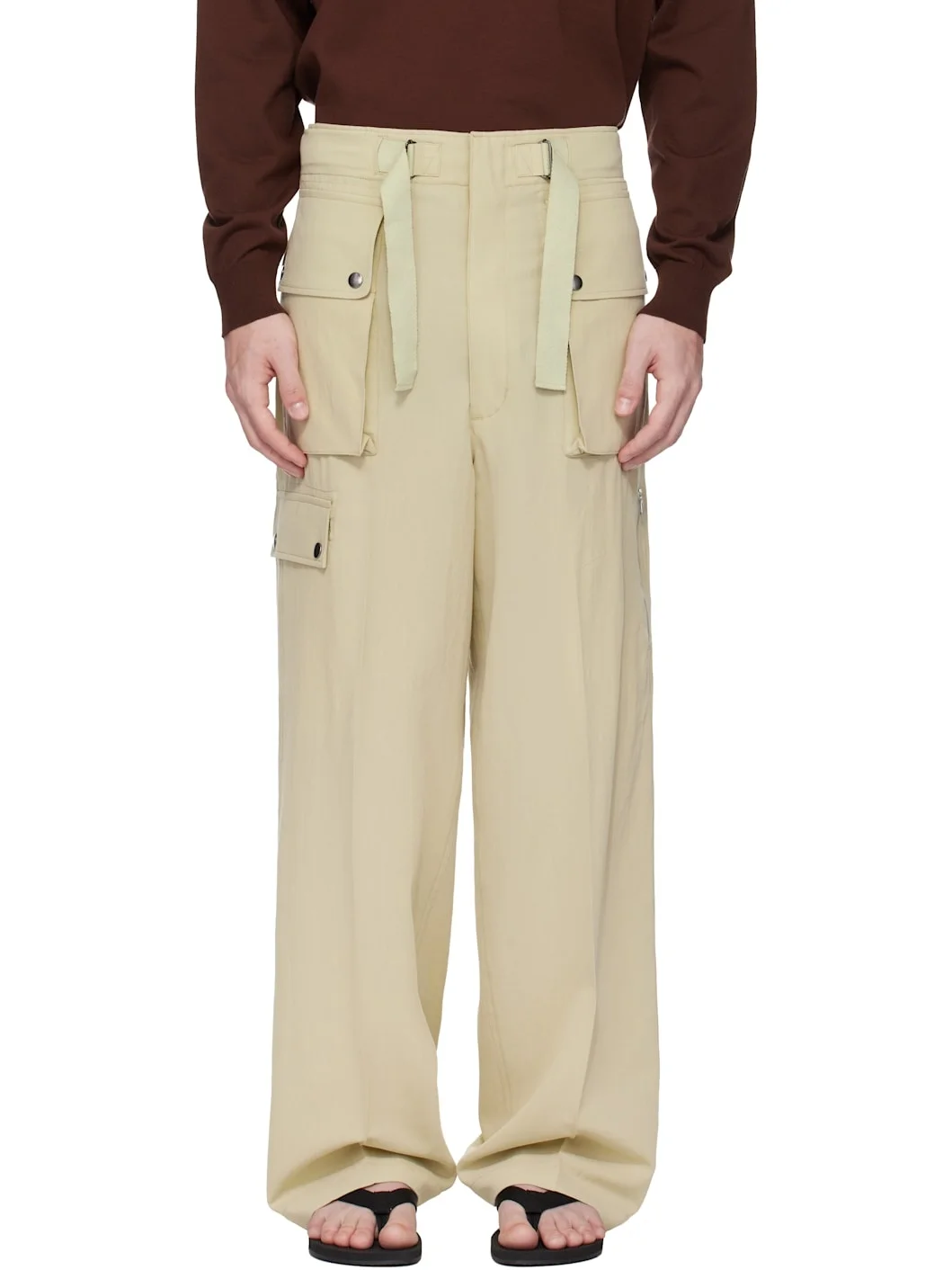 Lightweight extra-long staple cotton- and wool-blend gabardine cargo pants. · Wide-leg · Cinch straps at waistband · Four-pocket styling · Creased legs · Cargo pocket at outseam · Zip pocket at outseam Supplier color: Light khaki 60% cotton, 40% wool. Made in Japan 252484M188000