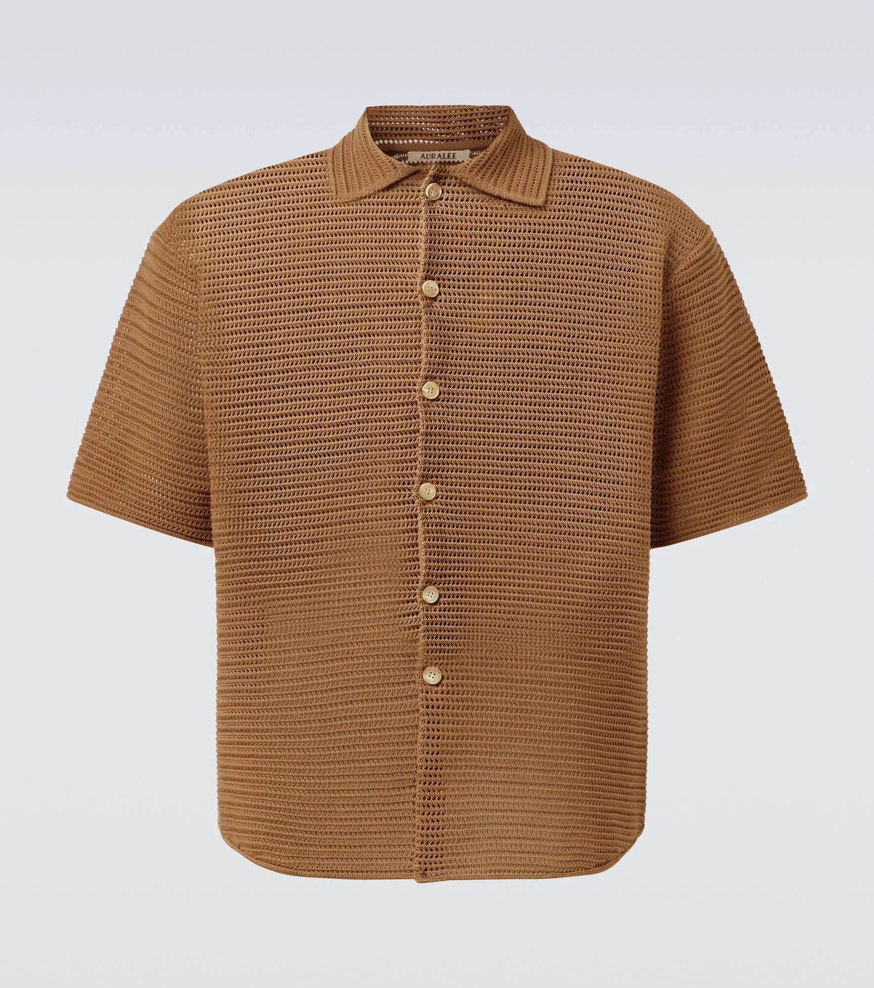 Auralee's river tailoring technique involves hand-stitching layers of fabric together to create lightweight and elegant garments. Crafted from robust cotton mesh, this short-sleeved shirt is knitted in a twisted pattern, resulting in a chunky texture reminiscent of crochet. Product Details - Material: 100% cotton - Care instructions: hand wash - Made in Japan - Designer color name: Khaki Brown - Item color: brown - Closure: buttoned front - Item number: P00983828 Size & Fit - True to size - Dropped shoulders - Semi-sheer - Straight fit - Slightly stretchy fabric - Falls to the hip - Height of model is 189cm-74.5" and wears a size 4