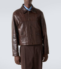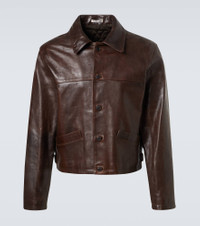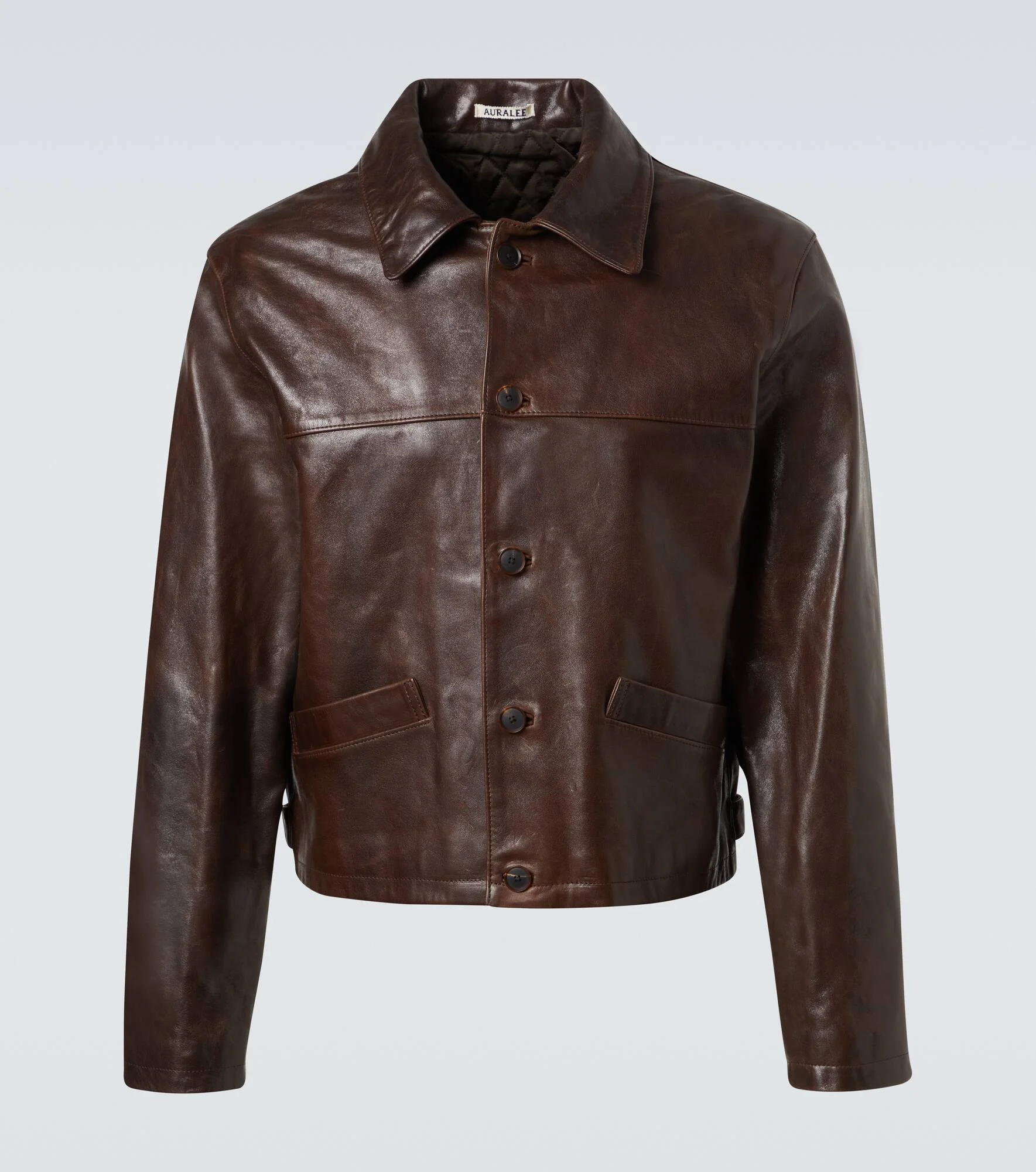 This jacket showcases Auralee's dedication to craft and attention to detail. The design is made from supple lamb leaher to a relaxed silhouette, featuring a buttoned front and a classic collar. Product Details - Material: 100% lamb leather - Care instructions: specialist clean - Made in Japan - Designer color name: Dark Brown - Item color: brown - Lining: 100% cupro - Filling: 100% polyester - Collar: classic (Straight point) - Closure: buttoned front - Pockets: slit pockets - Item number: P01068768 Size & Fit - True to size - Straight fit - Stiff material - Non-stretchy fabric - Cropped - Height of model is 192cm-75.5" and wears a size 5