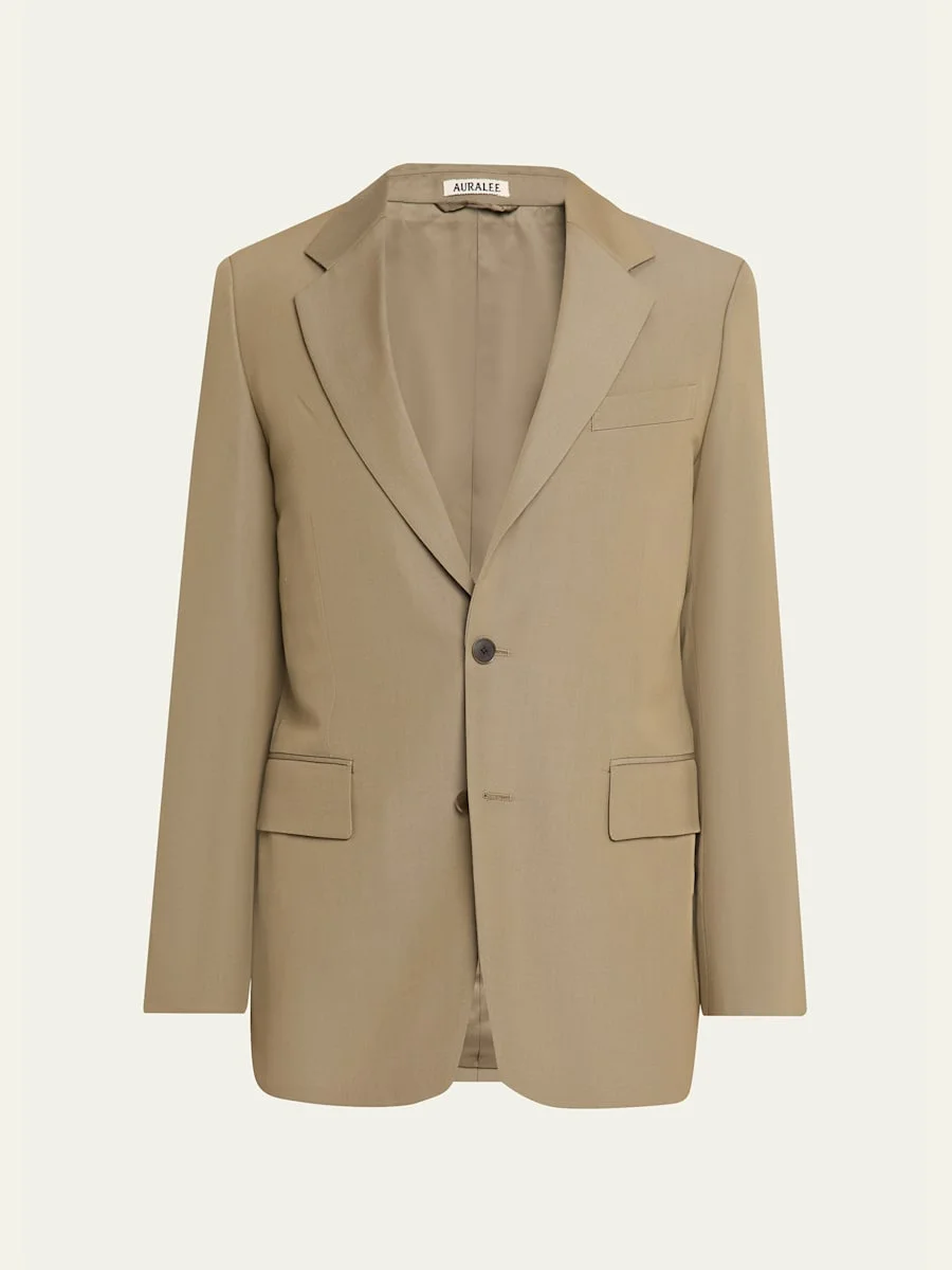 AURALEE lightweight wool blazer features a structured yet soft shoulder line and a defined waist. Understated horn buttons complete this sartorial garment. Notched lapels Long sleeves Fourbutton cuffs Chest welt pocket Two flap pockets Cutaway hem Singlebreasted closure Wool Made in Japan